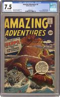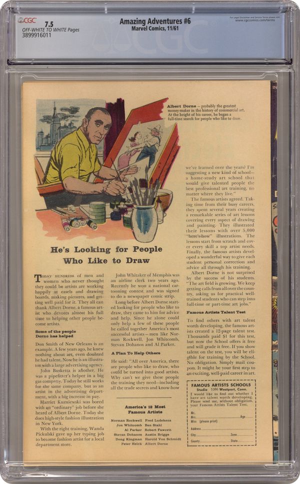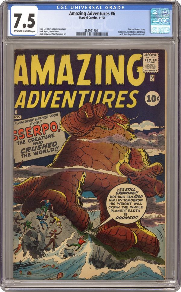 Final issue of the series. Cover pencils by Jack Kirby, inks by Dick Ayers. Sserpo! The Creature Who Crushed the Earth!, script by Stan Lee, pencils by Jack Kirby, inks by Dick Ayers; A growth serum is abandoned and eaten by a lizard, which grows big enough to menace the Earth. Muscle Man text story. The Fourth Man, script by Stan Lee, art by Steve Ditko; Two thugs attempt to mug a kindly old man in the park when a statue comes to his aid. Krogg!, script by Stan Lee, art by Paul Reinman; Dr. Droom investigates the disappearance of several houses, and finds that an alien disguised as a scientist is to blame. 36 pgs. $0.10. Cover price $0.10. Grade: CGC 7.5 explanation of grade Condition: Used (collectible)