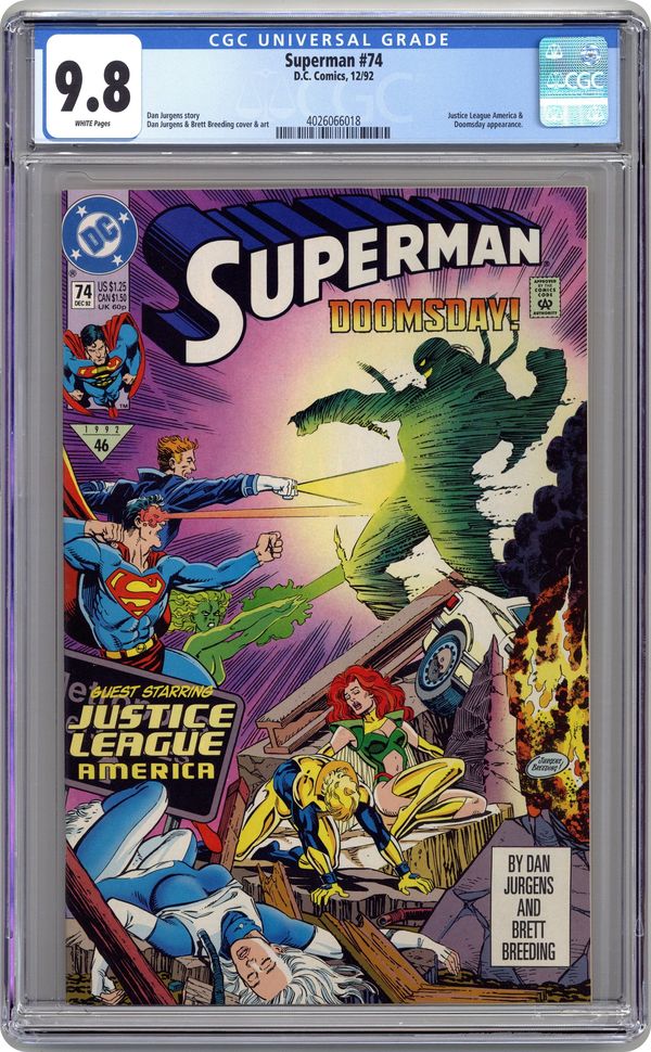 1st printing. Doomsday! Part 3 of 7. "Countdown to Doomsday!" Guest-starring the Justice League. Story by Dan Jurgens. Art by Dan Jurgens and Brett Breeding. Story continued from Justice League America #69. An extremely powerful new villain has just trounced the Justice League - with one arm tied behind his back, literally - and now the only thing standing in this unstoppable force's way is the Man of Steel. But if Superman doesn't let Doomsday get away, his fellow Justice Leaguers may perish. Story continues in Adventures of Superman (1939-2006) #497. Cover price $1.25. Grade: CGC 9.8 explanation of grade Condition: Used (collectible)