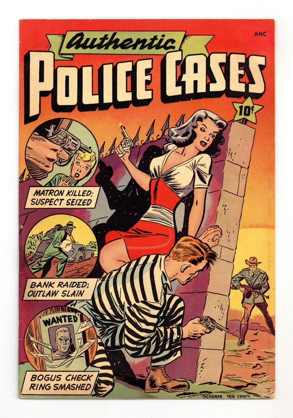 Cover art by Bob Lubbers. The Couple Who Came to Kill! (or The Case of the Whispering Bride). The Red Desperado, art by Gus Ricca; An escaped desperado is hunted by a posse of eight men with dogs. Case 1: Master Forgers--Science Corners the Criminals!, script and art by Jack Cole. Murder Fumbles a Doublecross, inks by Bernard Sachs; An antique dealer reports an emerald stolen and frames a released convict for the theft. The Phantom of Marco's Villa, art by Ralph Mayo; The ghost of Nancy's murdered father shows her where his money was hidden. 36 pgs. $0.10. Cover price $0.10. Grade: GD/VG 3.0 explanation of grade Condition: Used (collectible)