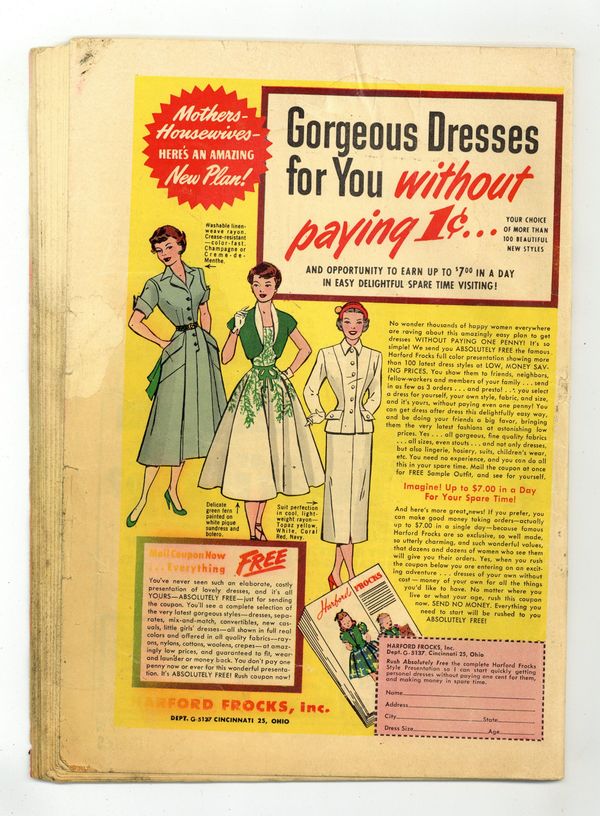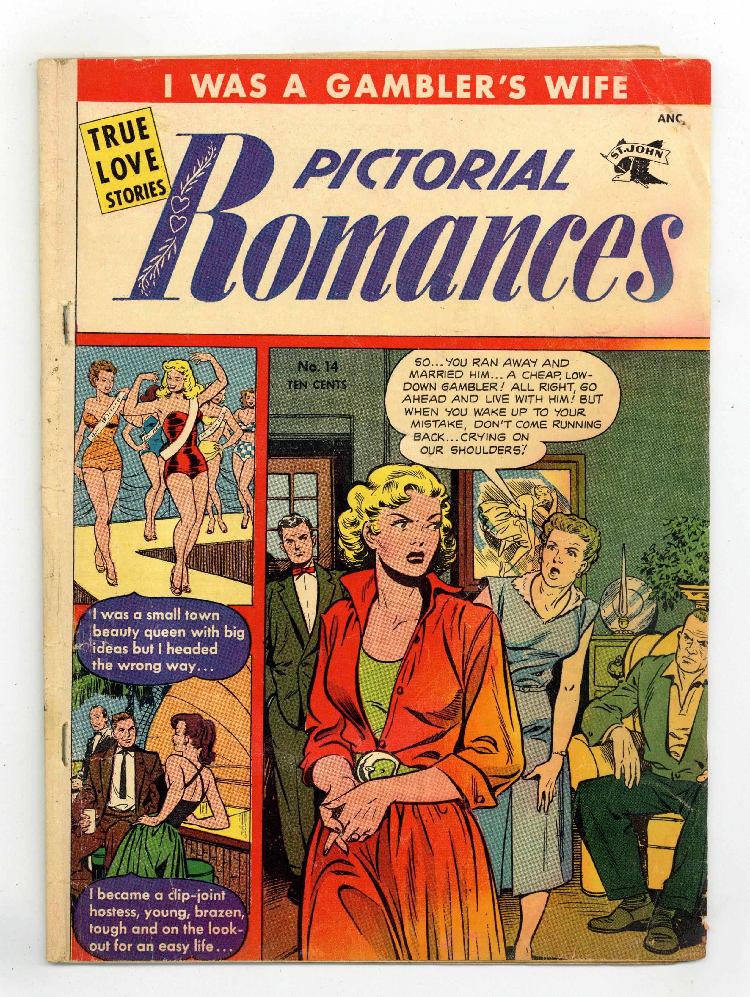Cover by Matt Baker. Stories and art by Matt Baker and others. Beautiful covers and art by legendary good-girl artist Matt Baker elevate St. John's 1950s romance comic above the norm. A woman becomes a "clip-joint hostess," scamming unwary men into spending exorbitant amounts at a bar, in a cautionary tale with art by Baker. In another cautionary tale, small-town beauty queen Carla enters a national contest judged on beauty and charm, and although she has beauty to spare, she's short on the charm. Mary gets her big break singing in a band alongside her trumpeter boyfriend Lenny, but Lenny warns her that the bandleader will make a play for her. Cover by Baker. The Wages of Innocence; Decoy Girl; Abandoned!; I Was a Small Town Beauty Queen; I Was a Gambler's Wife; Music Madness. 32 pages, Full Color. Cover price $0.10. Grade: GD 2.0 explanation of grade Condition: Used (collectible)