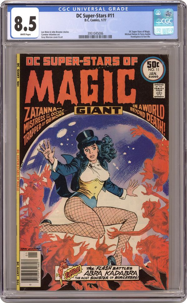 DC Super-Stars of Magic. Zatanna -- mistress of the occult -- trapped by demons in a world beyond death! Plus: The Flash battles Abra Kadabra, the most sinister of sorcerers! Featuring: 1 page DC Super-Stars of Magic story "Contents" written by Carl Gafford and drawn by Michael Netzer (as Mike Nasser) & Terry Austin; 17 page Zatanna reprint story "Zatanna the Magician" written by Len Wein and drawn by Gray Morrow; 1 page text article "The Great Houdini" written by Carl Gafford and drawn by Michael Netzer (as Mike Nasser) & Terry Austin; 1 page text article "Conjuring through the Ages" written by Carl Gafford; 13 page Flash (Barry Allen) reprint story "The Case of the Real-Gone Flash" written by John Broome and drawn by Carmine Infantino & Joe Giella; 1 page Magic Tricks You Can Do activity "The Coin in the Glass" by Carl Gafford and Vince Colletta; 1 page Magic Tricks You Can Do activity "The Disappearing Coin" by Carl Gafford and Vince Colletta; 1 page Magic Tricks You Can Do activity "The Magical Prediction" by Carl Gafford and Vince Colletta. Cover by Gray Morrow. Cover price $0.50. Grade: CGC 8.5 explanation of grade Condition: Used (collectible)