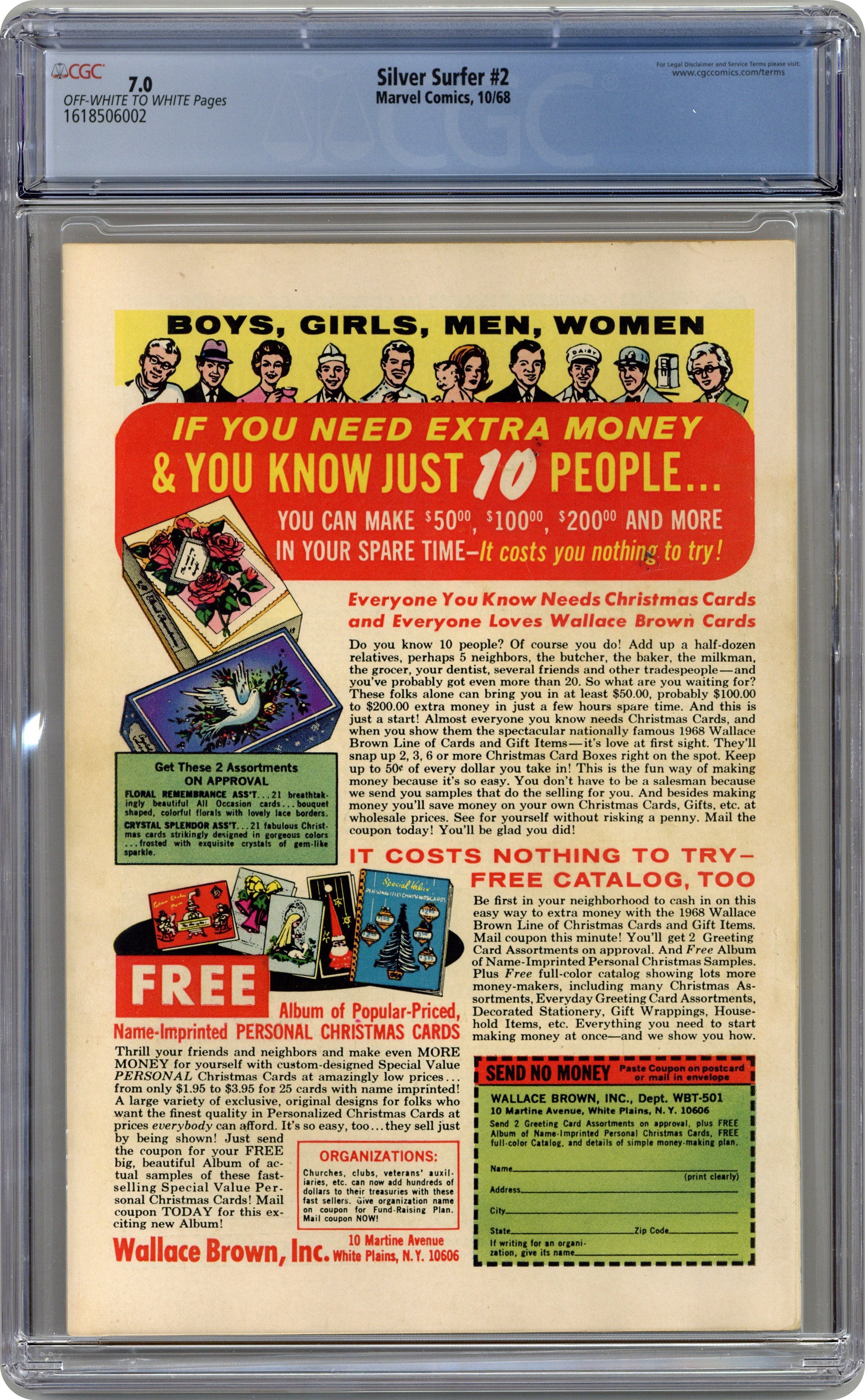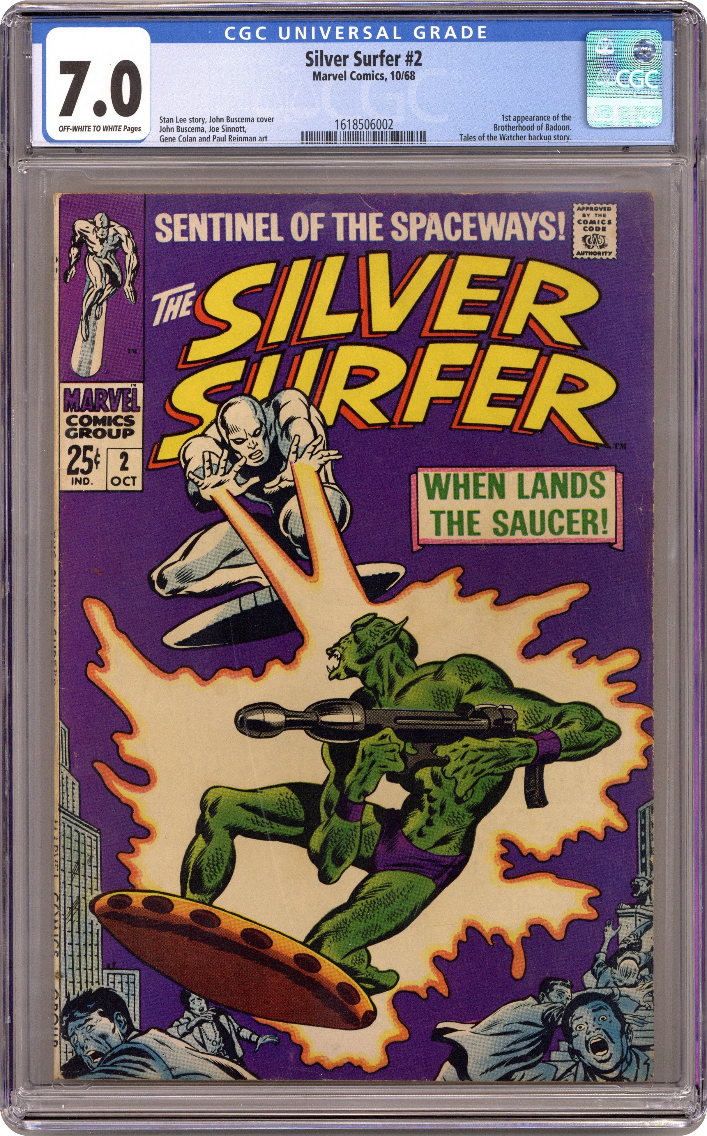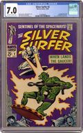 "When Lands the Saucer!" Written by Stan Lee. Art and cover by John Buscema and Joe Sinnott. Exiled to planet Earth by his former master, Galactus, the Silver Surfer, a being empowered with the Power Cosmic itself, finds he cannot penetrate the invisible barrier which the Devourer of Worlds has encompassed the planet with. However, this barrier does not prevent others from beyond the stars from coming to Earth and wrecking havoc. Thus, when a malevolent race of aliens descend upon the unsuspecting citizens of Earth, only the Silver Surfer possesses the power to stop them. Includes the Watcher back-up "The Coming of the Krills!" Story by Stan Lee. Art by Gene Colan and Paul Reinman. 68 pages Cover price $0.25. Grade: CGC 7.0 explanation of grade Condition: Used (collectible)