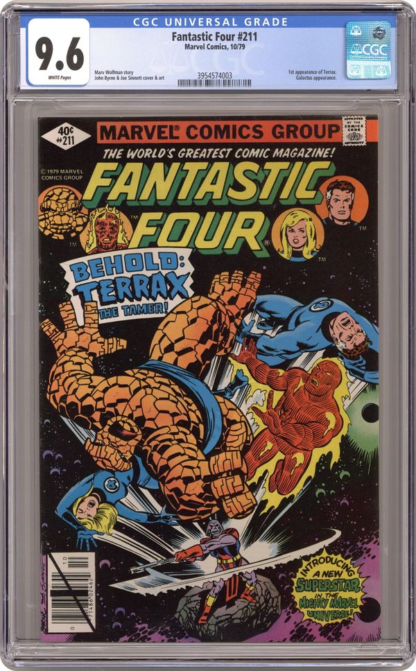 Direct Edition. 1st appearance of Terrax the Tamer - "If This Be Terrax" Written by Marv Wolfman. Pencils by John Byrne. Inks by Joe Sinnott. Cover by John Byrne and Joe Sinnott. Galactus sends the Fantastic Four to an alien plant to capture its tyrannical ruler named Tyros! Can the three aging members of the FF plus the Human Torch muster the strength to defeat Tyros? Cameo appearance by the Watcher and flashback appearances by the Silver Surfer, Air Walker, and Firelord. Note: First appearance of Terrax the Tamer. 36 pgs. Cover price $0.40. Grade: CGC 9.6 explanation of grade Condition: Used (collectible)