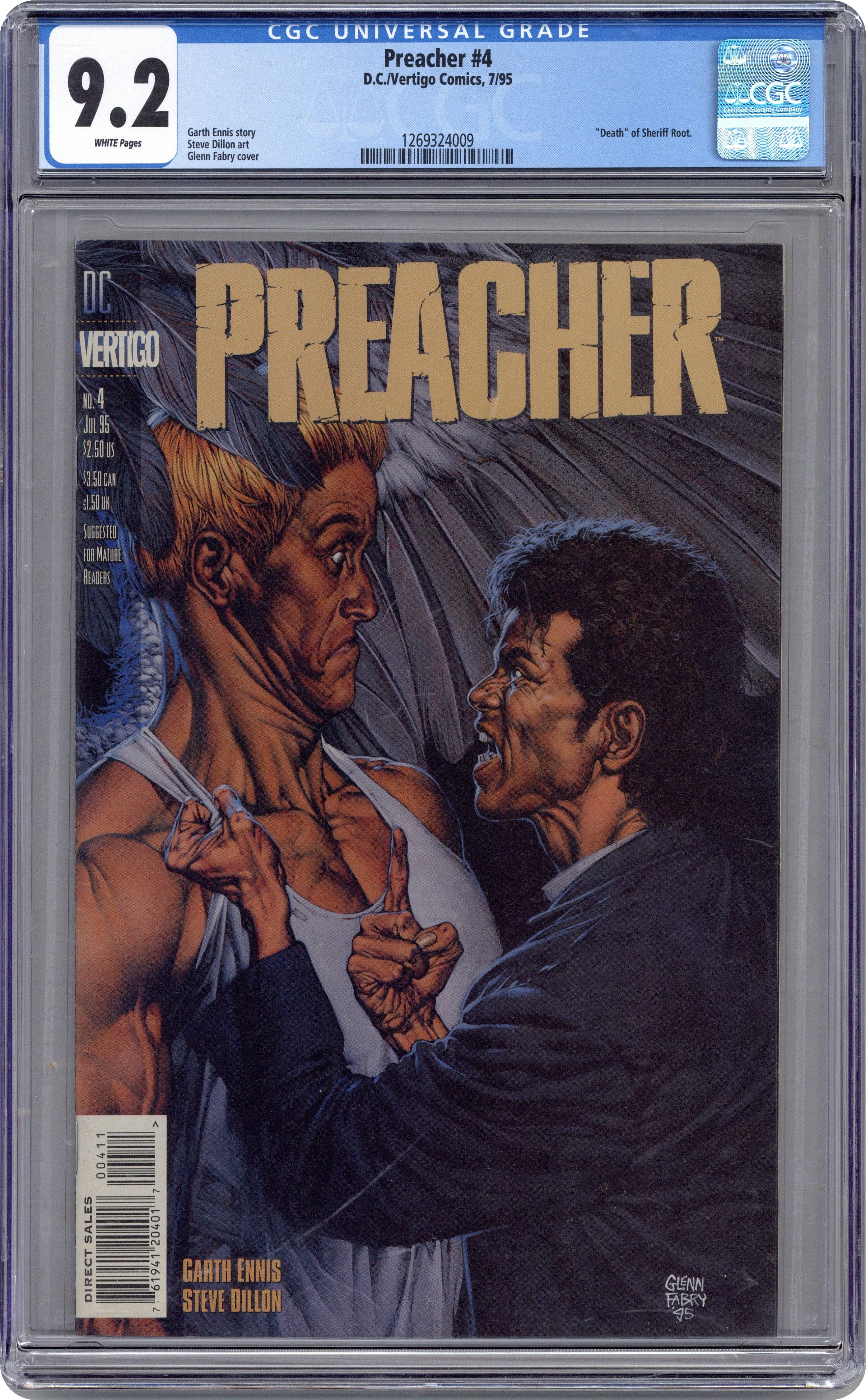 Painted cover by Glenn Fabry. Standing Tall, script by Garth Ennis, art by Steve Dillon; Custer discovers that God has left Heaven. 36 pgs. $2.50. Cover price $2.50. Grade: CGC 9.2 explanation of grade Condition: Used (collectible)