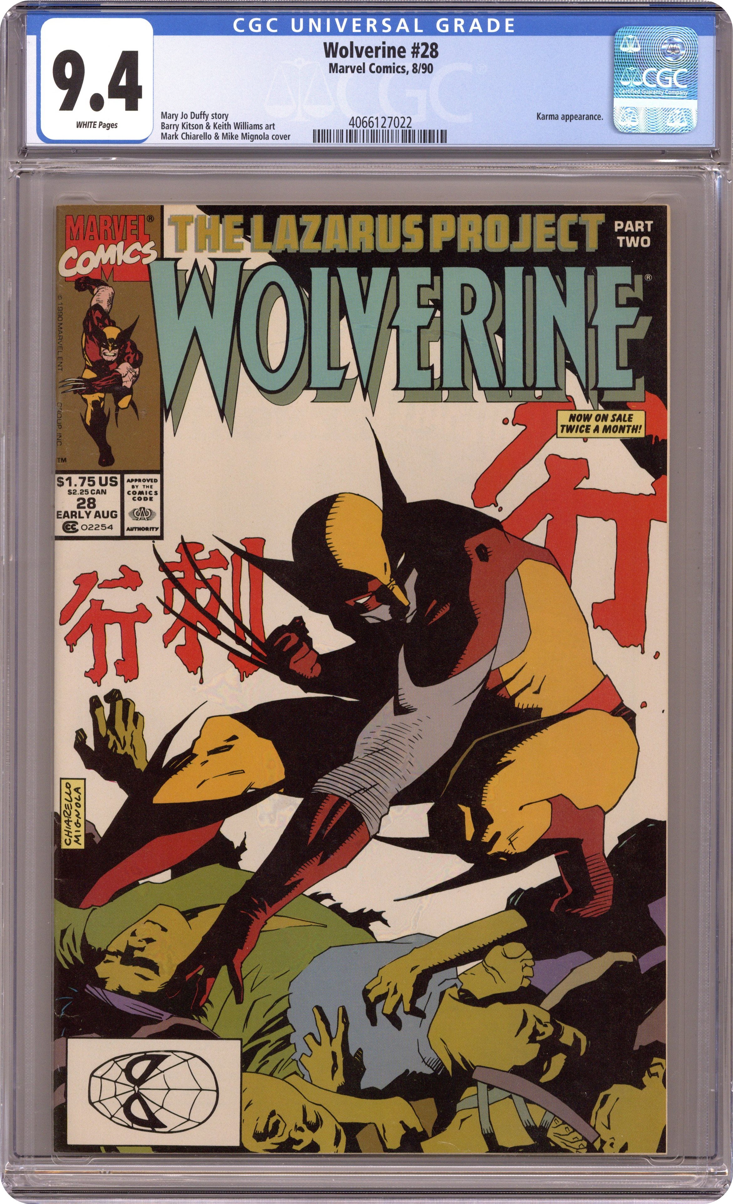 The Lazarus Project: Part 2 of 4 - "The Stranger!" Written by Jo Duffy. Art by Barry Kitson and Keith Williams. Cover by Mark Chiarello and Mike Mignola. Washing up on the shores of Rumika, Wolverine has no memory of who he is or how he got here. What he does know is that he doesn't take kindly to the cadre of mercenaries slaughtering the citizens of a local village as they search for the Master Form. 32 pages, FC Cover price $1.75. Grade: CGC 9.4 explanation of grade Condition: Used (collectible)