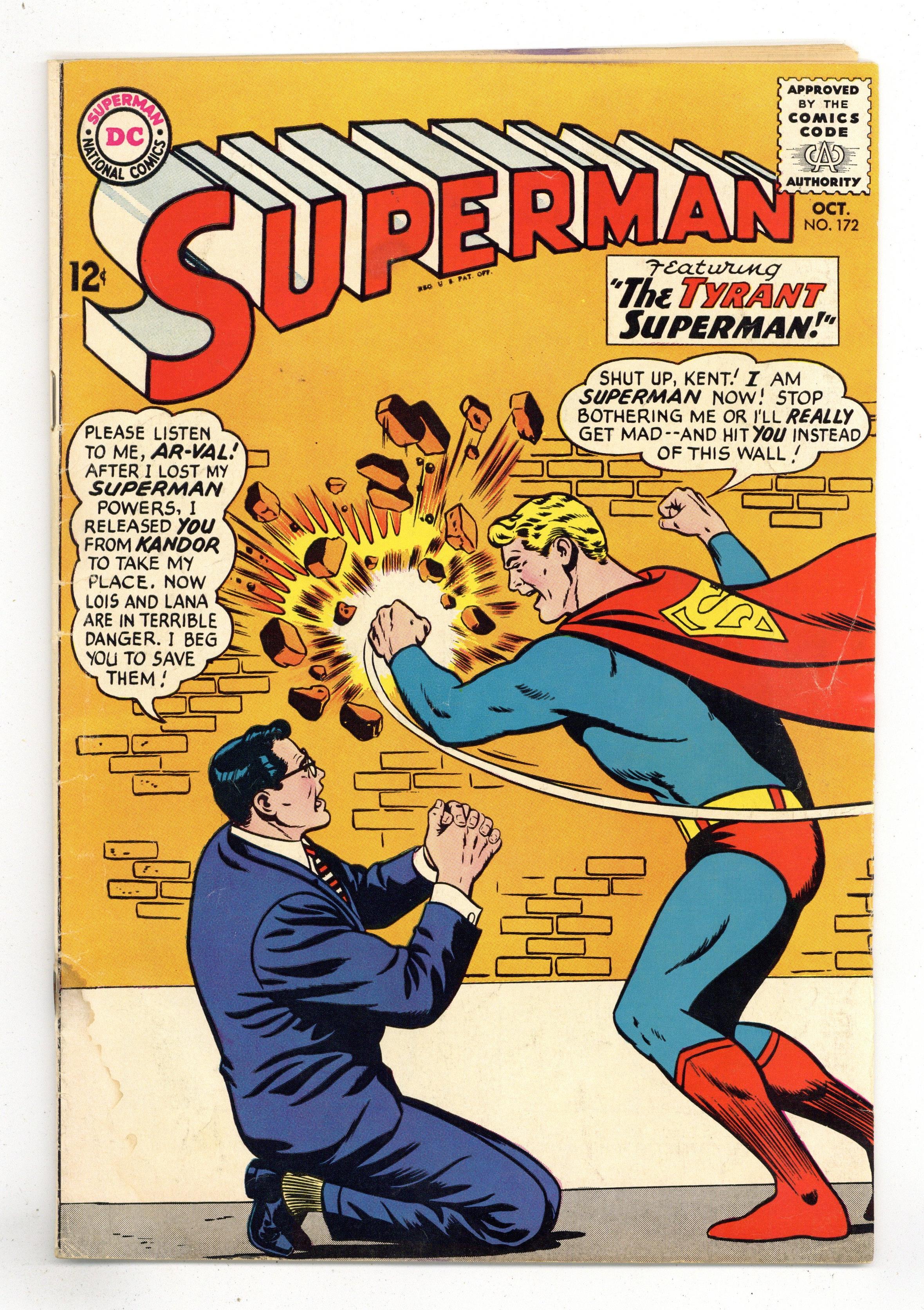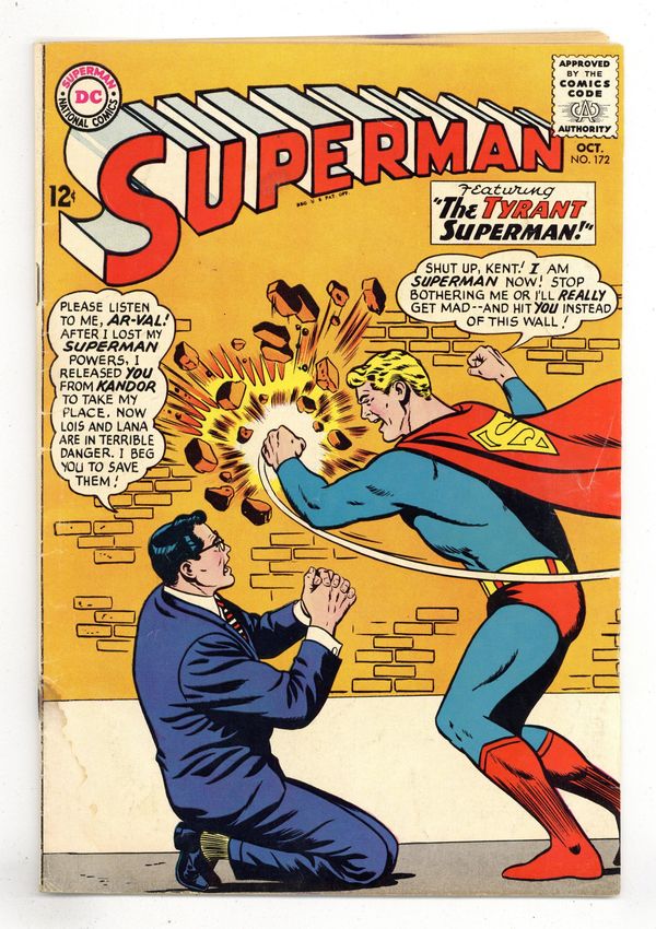 Cover pencils by Curt Swan, inks by George Klein. The New Superman! [part 1], script by Edmond Hamilton, pencils by Curt Swan, inks by George Klein. Clark Kent--Former Superman! [part 2], script by Edmond Hamilton, pencils by Curt Swan, inks by Sheldon Moldoff. The Struggle of the Two Supermen! [part 3], script by Ed Hamilton, pencils by Curt Swan, inks by George Klein. In this three-part story, Superman releases Ar-Val from Kandor so he can replace The Man of Steel. Rocky and Bullwinkle star in a one-page Cheerios ad. 36 Pages, Full Color. Cover price $0.12. Grade: VG- 3.5 explanation of grade Condition: Used (collectible)