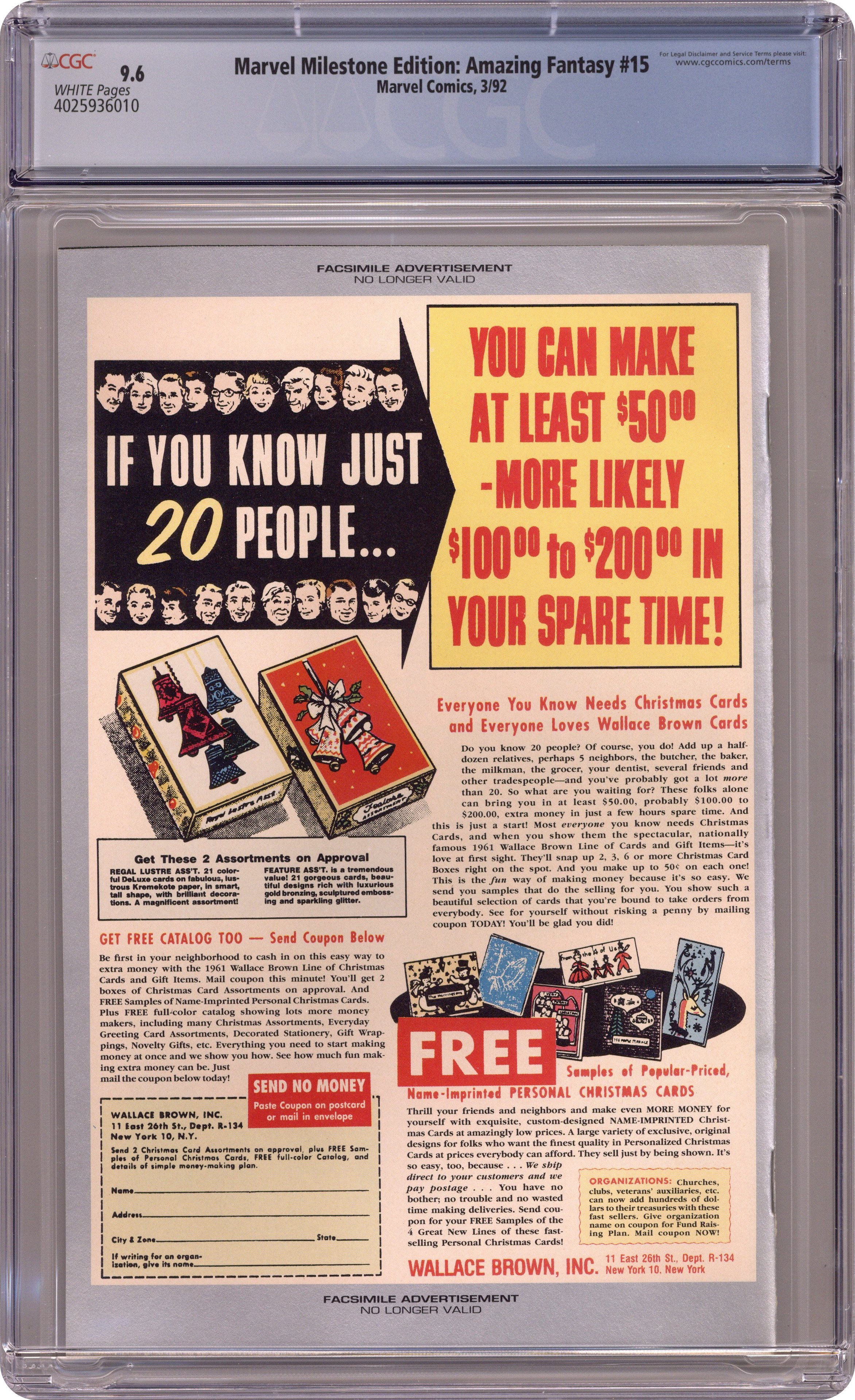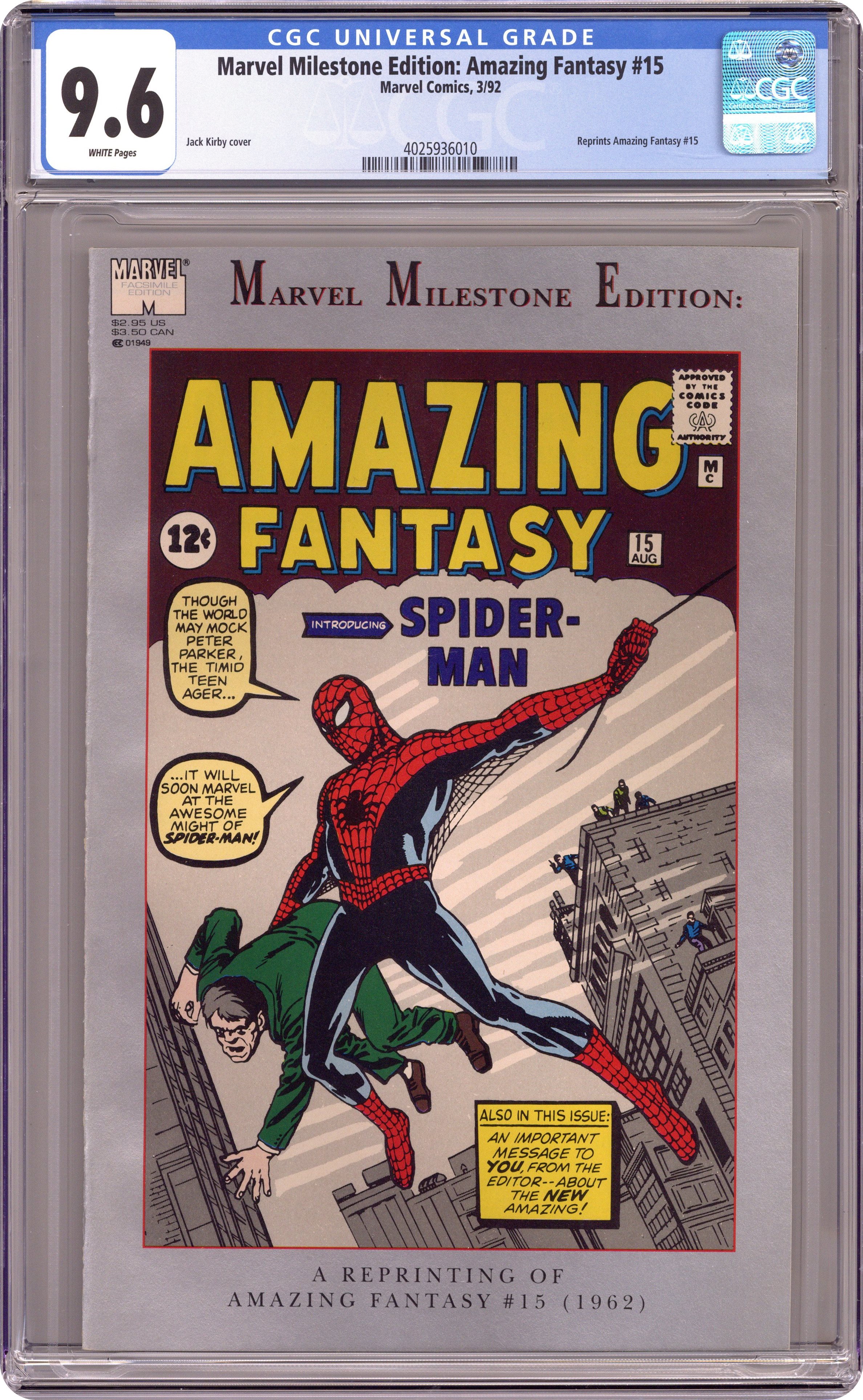 Reprints Amazing Fantasy 15 by Steve Ditko (1st Spider-Man) Cover price $2.95. Grade: CGC 9.6 explanation of grade Condition: Used (collectible)