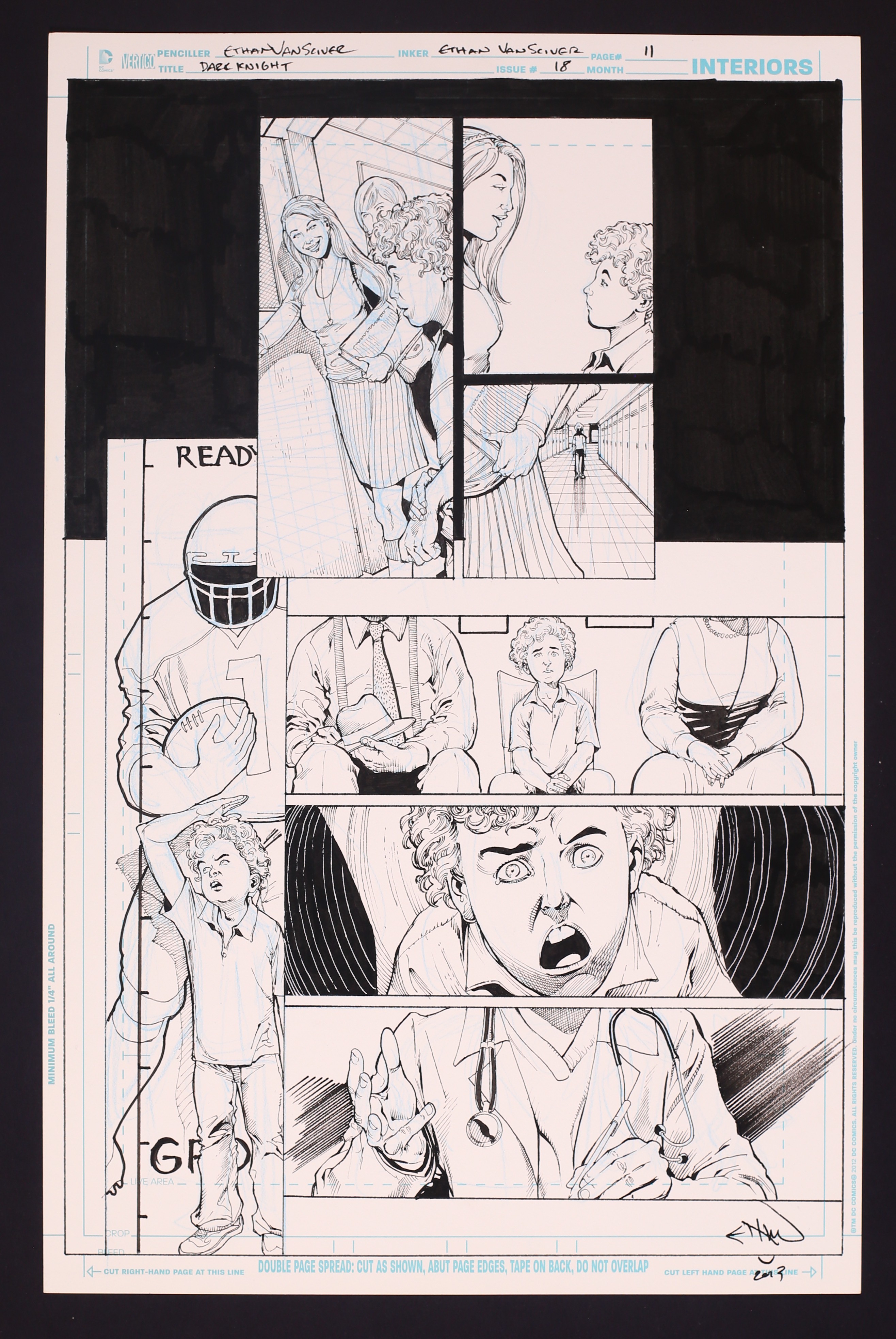 Original Art from Batman the Dark Knight #18 (2013), Page 11 Pencils and Inks by Ethan Van Sciver. A flashback to the troubled youth of Jervis Tetch, the Mad Hatter! Here we see young Jervis unsuccessfully asking a girl to a dance, and then being told that he has a testosterone deficiency- quite the bad day! Signed by the artist in bottom margin. Pencil and ink on DC Comics art board. 11" x 17", B&W.