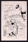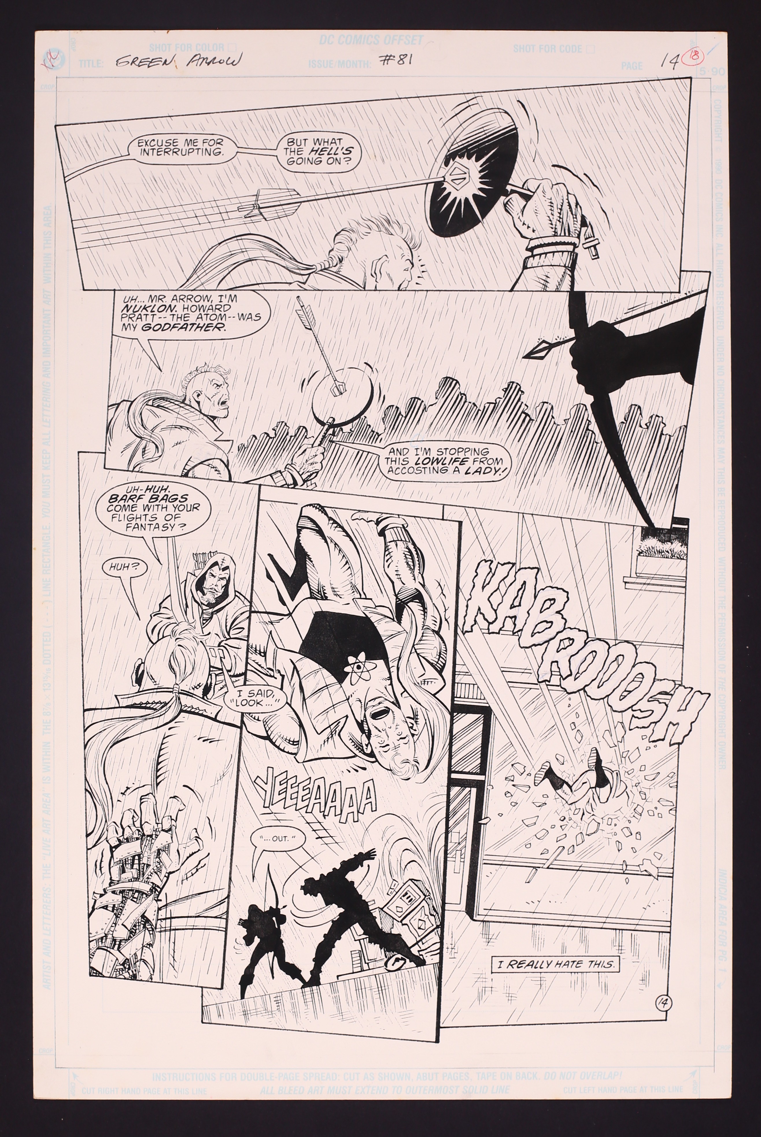 Original Art from Green Arrow #81 (1993) Page 14 Pencils by Jim Aparo, Inks by Gerry Fernandez. The Emerald Archer stumbles onto a fight between Nuklon, grandson of the Golden Age Atom, and the supervillain Shrapnel over what else- a woman. A fantastic fight page with off kilter panels! Pencil and ink on DC Comics art board. 11" x 17", B&W.