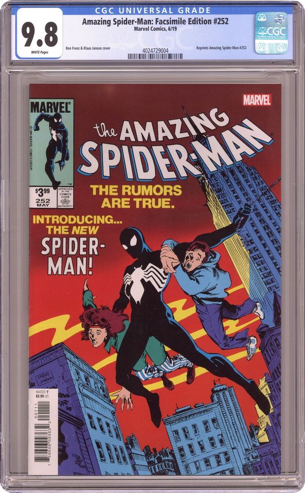Written by Roger Stern and Tom DeFalco. Art and Cover by Ron Frenz. The stunning debut of Spider-Man's black suit - the alien costume that would one day become Venom! As Spidey makes his homecoming from the super hero Secret Wars, he returns with a miraculous new outfit, a striking black-and-white Spider-Man costume that morphs and responds to his very thoughts - allowing him to change back to Peter Parker at will! But is it possible that this miraculous article of alien clothing may have a mind of its own? With New Yorkers made uneasy by his new look and the Secret Wars photos he took far too alien to sell to the Daily Bugle, can Peter pick up the life he left behind? Relive the issue that set in motion the entire saga of Venom! It's one of the all-time great Marvel comic books, boldly re-presented in its original form, ads and all! 32 pages, full color. Rated T Cover price $3.99. Grade: CGC 9.8 explanation of grade Condition: Used (collectible)
