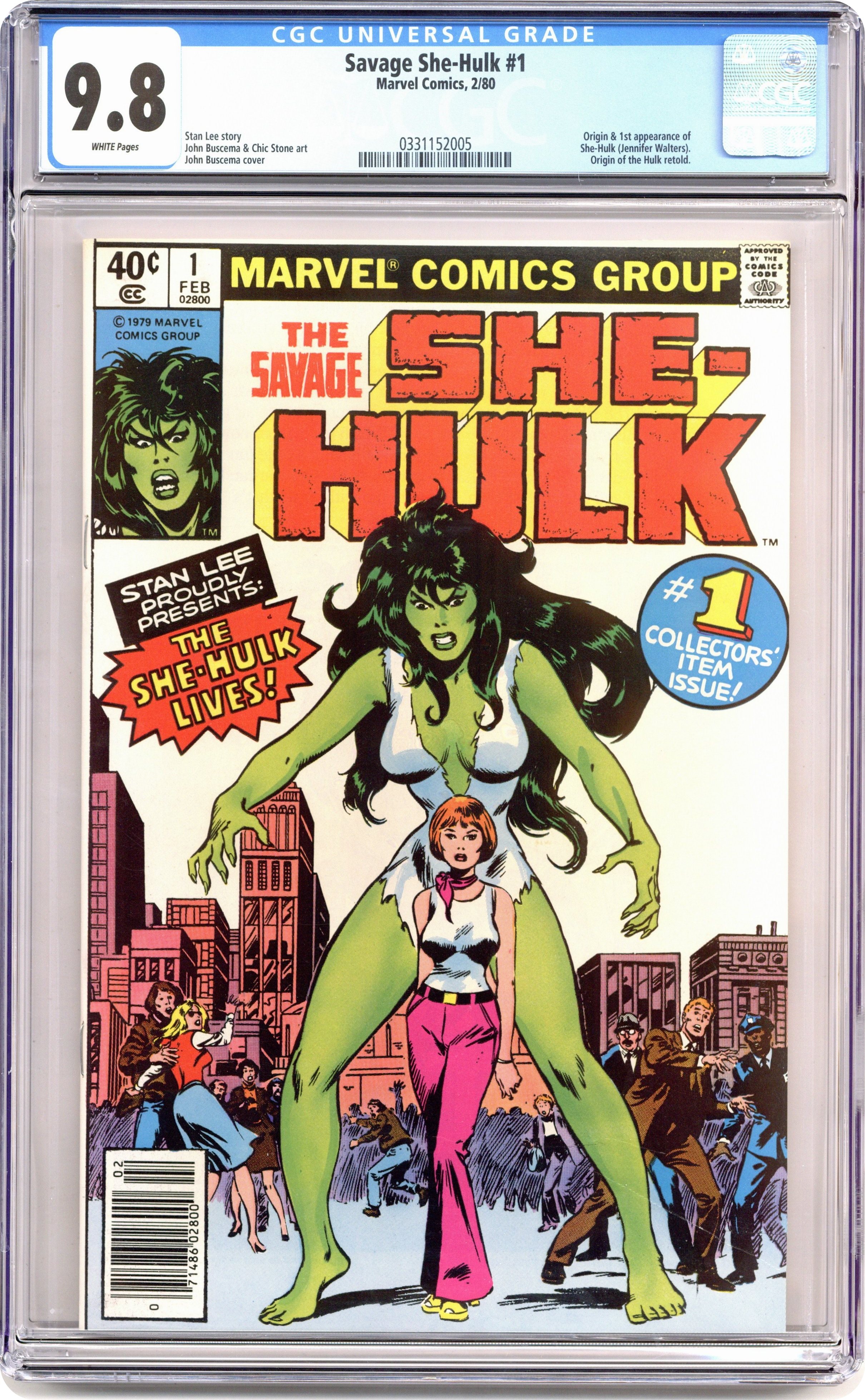 Newsstand Edition. 1st appearance and origin of the She Hulk. "The She-Hulk Lives!" Guest-starring Bruce Banner. Story by Stan Lee. Art by John Buscema and Chic Stone. Jennifer Walters is on the verge of death after an attempted assassination, and the only thing that will save her life is a blood transfusion from her cousin, Bruce Banner...AKA the Incredible Hulk! His gamma-irradiated blood sparks a startling transformation in his cousin, and she will forevermore be known as the Savage She-Hulk! Cover price $0.40. Grade: CGC 9.8 explanation of grade Condition: Used (collectible)
