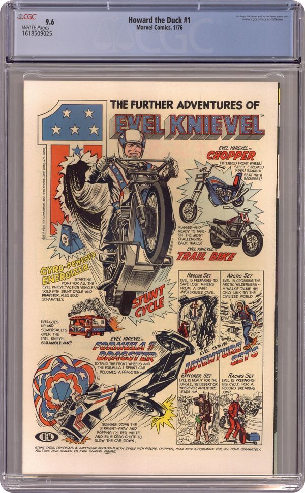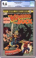 Written by Steve Gerber. Art by Frank Brunner and Steve Leialoha. Cover by Frank Brunner. Howard the Barbarian; Legendary creators Steve Gerber and Frank Bruner present the audacious, quirky, downright filthy Howard the Duck in his own ongoing series!; Howards debut adventure guest stars a plethora of Marvel Heroes--Spider-Man, Conjurer, and many more; Howard is thinking of committing suicide and then finds himself involved in a bizarre adventure where he meets Beverly Switzler and Spider-Man for the first time, and faces off against Pro-Rata, the Financial Wizard. Continued from Giant-Size Man-Thing #5. 36 pgs., full color. $0.25. Cover price $0.25. Grade: CGC 9.6 explanation of grade Condition: Used (collectible)