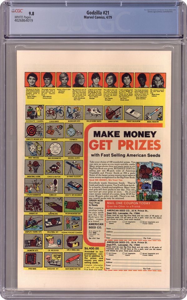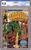 "A Night at the Museum!" Part 5 of 8. Guest-starring the Fantastic Four, Moon Boy, and Devil Dinosaur. Story by Doug Moench. Art by Herb Trimpe and Dan Green. Using the time machine created by the nefarious Doctor Doom , Reed Richards sends Godzilla back in time to a place where he might fit in better, the prehistoric land of dinosaurs. Here a still smaller version of Godzilla is confronted by another creature of legend, the feisty crimson T-Rex known as Devil Dinosaur. Cover price $0.35. Grade: CGC 9.8 explanation of grade Condition: Used (collectible)