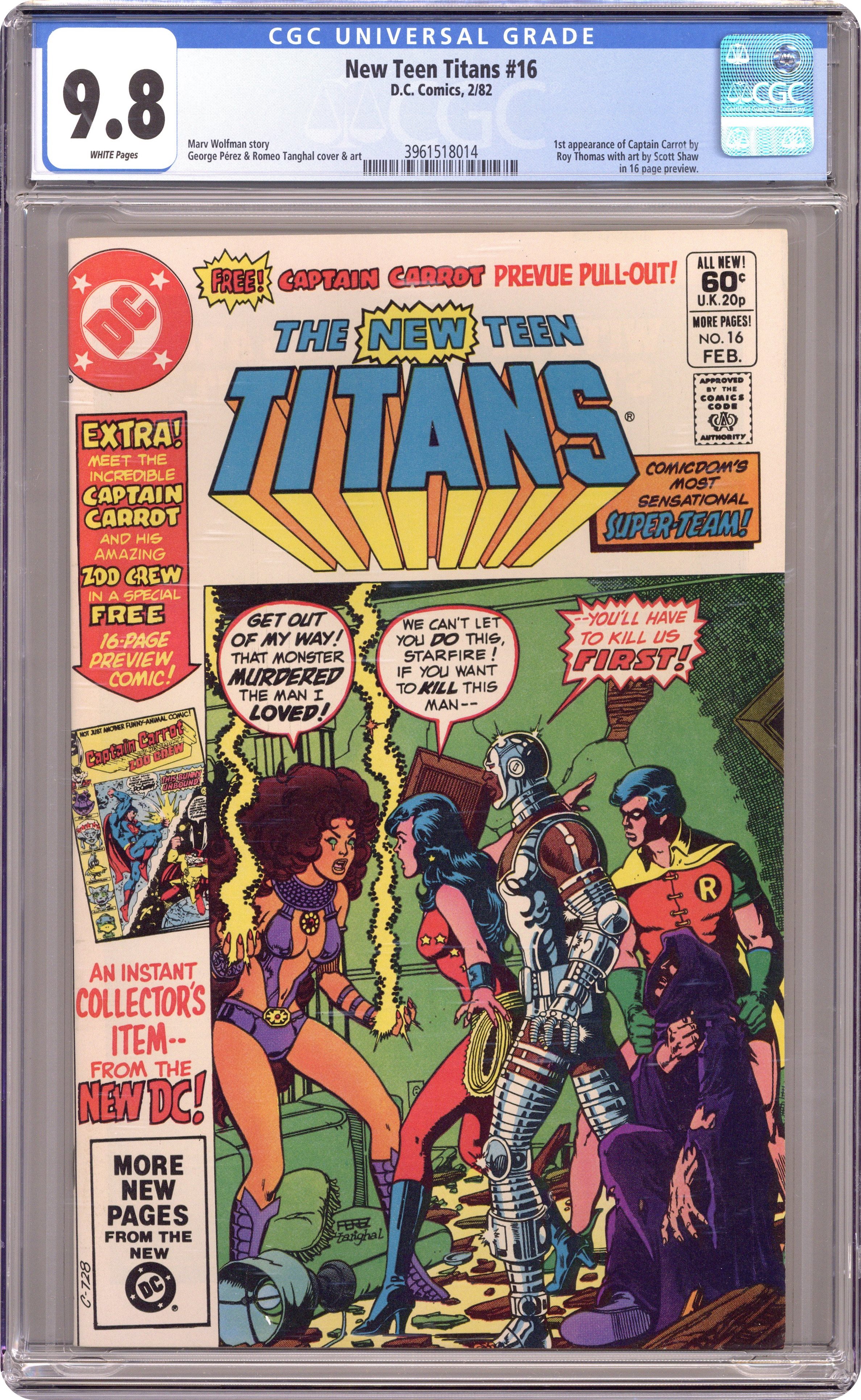 Direct Edition. Raven starts college, while Starfire's bubble is suddenly burst by the H.I.V.E. in "Starfire Unleashed!" Script by Marv Wolfman, pencils by George Perez, inks by Romeo Tanghal. 27 pages of story. Bonus 16-page tale: Superman encounters Captain Carrot and his Amazing Zoo Crew in "This Bunny Unbound!" Script by Roy Thomas, pencils by Scott Shaw! and Ross Andru, inks by Bob Smith. Perez/Tanghal cover. 1st appearance of Captain Carrot. Cover price $0.60. Grade: CGC 9.8 explanation of grade Condition: Used (collectible)