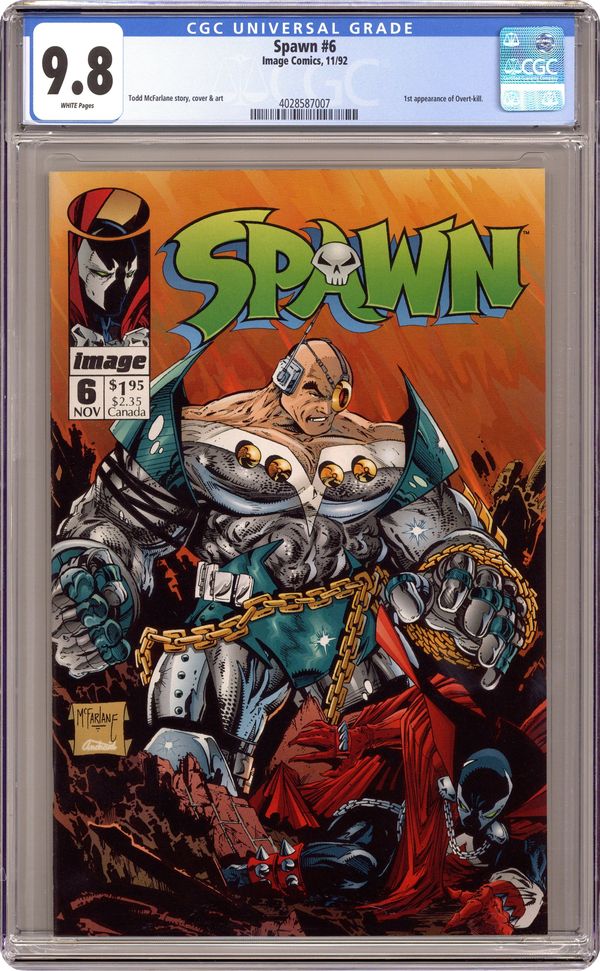 "Payback!" Part 1 of 2. 1st appearance of Overtkill. Created, story, and art by Todd McFarlane. Mafioso boss, Tony Twist, blames the new shadowy hero, Spawn, for the resent attacks on his men. Twist wants Spawn dead. Twist is a man who is used to getting what he wants. Enter: Overtkill, a cyborg killing machine who never fails. NOTE: Overtkill was created on an art training video featuring Stan Lee, Todd McFarlane, and Rob Liefeld. When Lee came up with the name "Overkill," Liefeld and McFarlane, using only the name, and within a matter of minutes, came up with the basic design for the character that would soon be known as Overtkill, a major villain in the Image Universe. - Odinson, Lone Star Comics Archivist Cover price $1.95. Grade: CGC 9.8 explanation of grade Condition: Used (collectible)
