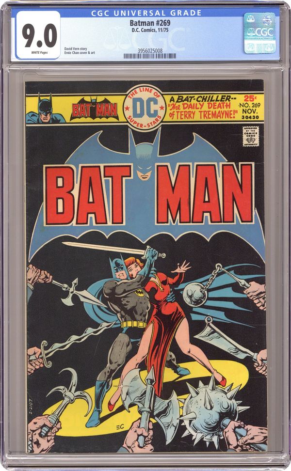 Cover art by Ernie Chan (as Ernie Chua). The Daily Death of Terry Tremayne starring Batman, script by David Vern (as David V. Reed), art by Ernie Chan (as Ernie Chua); Batman must protect Terry Tremayne from bad guys who want her valuable Florentine box. Hostess Twinkies ad starring Captain Marvel, pencils by Curt Swan, inks by Vince Colletta. 36 Pages, Full Color. Cover price $0.25. Grade: CGC 9.0 explanation of grade Condition: Used (collectible)