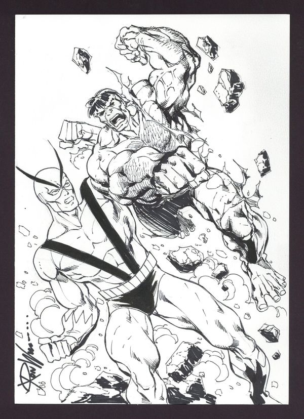 Hulk vs. Giant-Man Sketch by Ron Williams. Signed by the artist. Pencil and ink on art stock. 7" x 10", B&W.