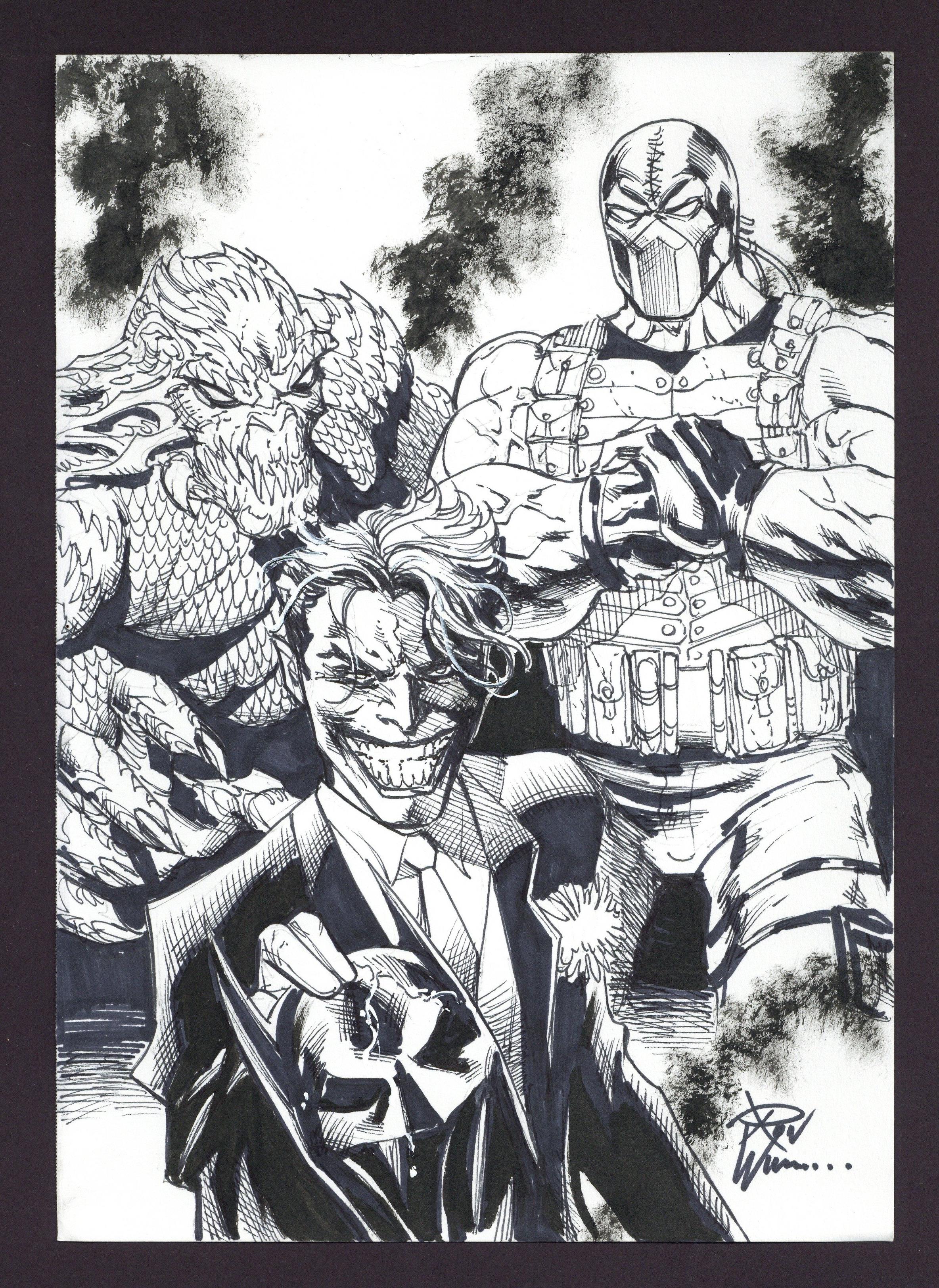 Joker, Bane, and Killer Croc Sketch by Ron Williams. Signed by the artist. Pencil and ink on art stock. 7" x 10", B&W.