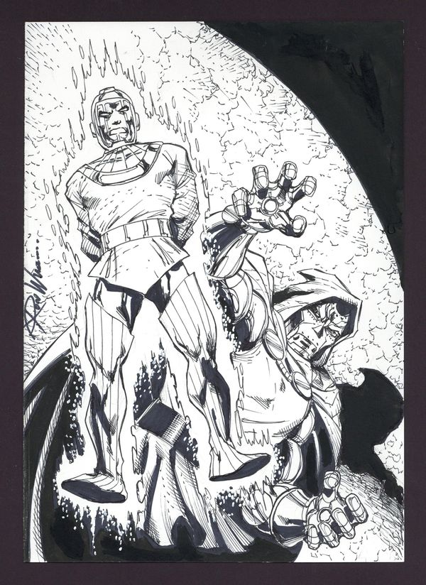 Kang and Doctor Doom Sketch by Ron Williams. Signed by the artist. Pencil and ink on art stock. 7" x 10", B&W.