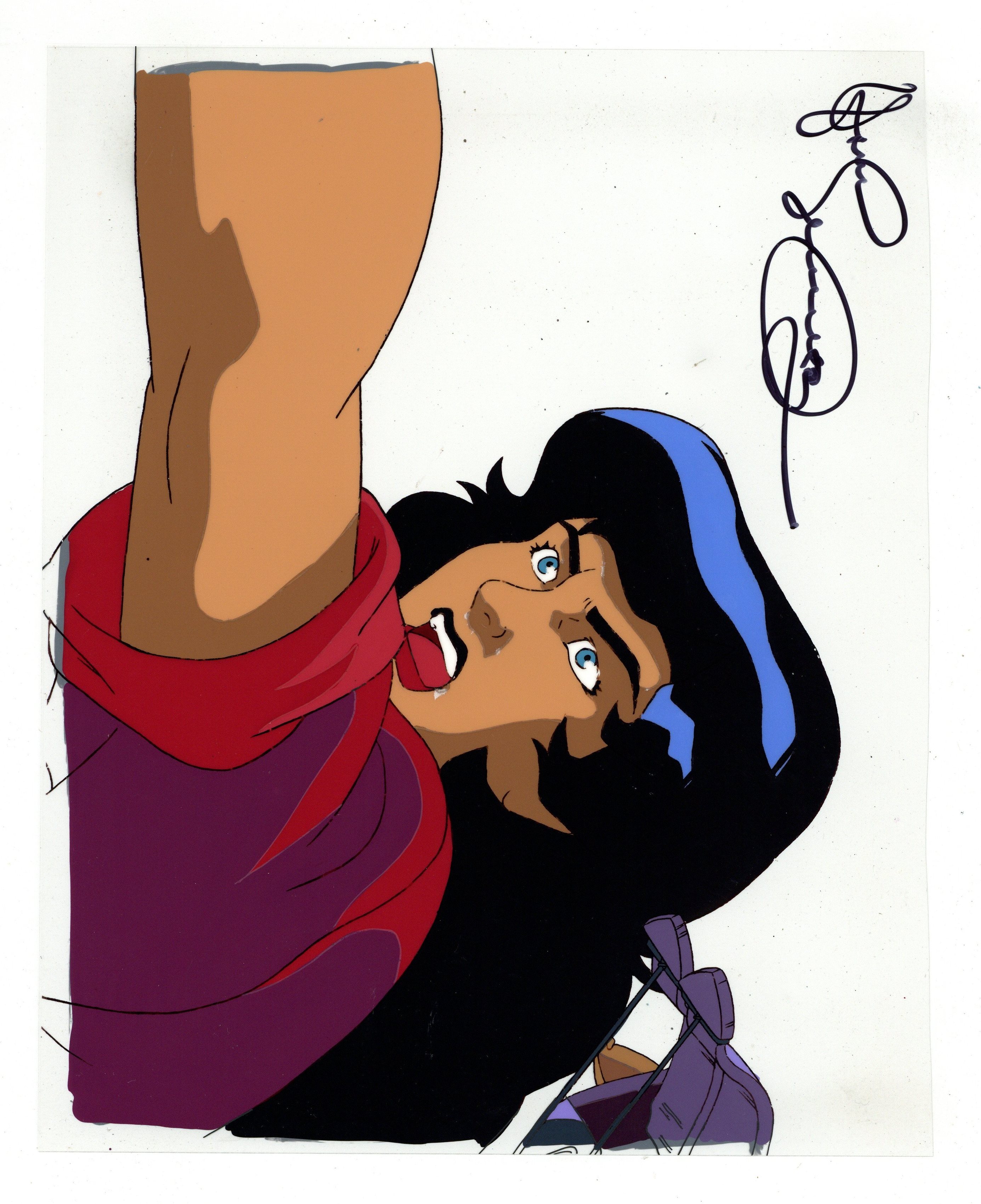 Original Animation Cel from Cadillacs and Dinosaurs. Signed by creator Mark Schultz. Features a dynamic closeup of Hannah Dundee! Hand-painted image on acetate. 8 1/2" x 10 1/4", full color.