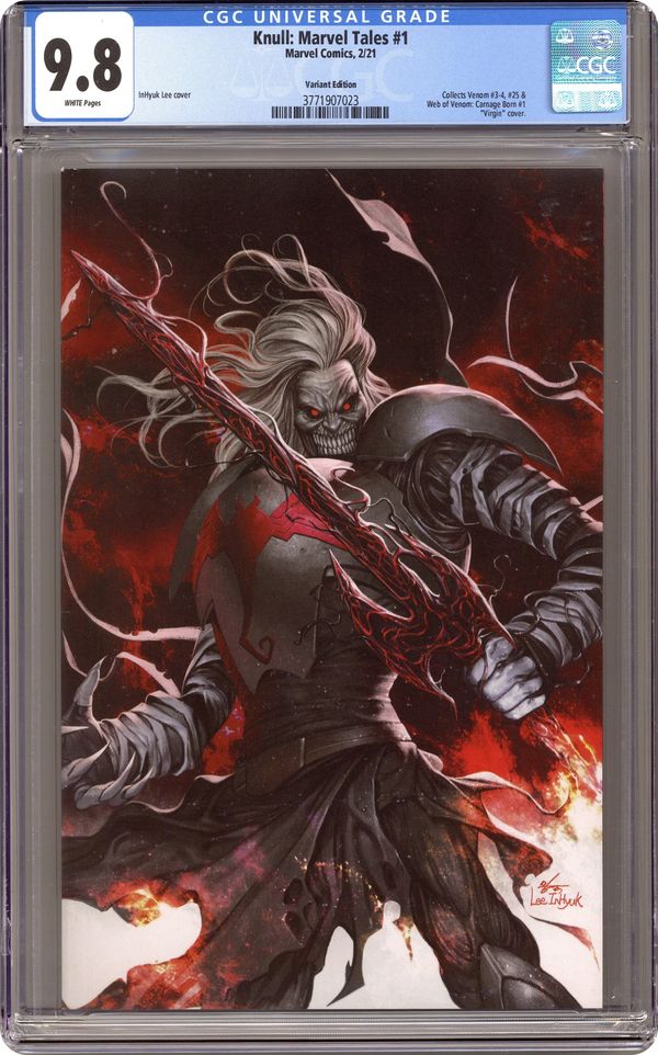 Limited 1 for 50 Retailer Incentive Variant Cover. Written by Donny Cates. Art by Ryan Stegman, Danilo S. Beyruth, Mark Bagley, JP Mayer and Andy Owens. Cover by Inhyuk Lee. Knull, god of the symbiotes, will haunt your nightmares as we celebrate the legacy of the House of Ideas with MARVEL TALES! This anthology series shines a spotlight on fan-favorite characters, features timeless stories and highlights some of Marvel's most impressive talent from the past eight decades. First, superstar creators Donny Cates and Ryan Stegman introduce Knull in crucial chapters of their sensational reinvention of the Venom mythos! In VENOM (2018) #3-4, Venom and Miles Morales stand in the way of a symbiote dragon terrorizing Manhattan - but what connects it to Knull? In VENOM: CARNAGE BORN, from Cates and Danilo Beyruth, a deadly cult resurrects the serial killer Carnage as an agent of Knull! And legendary artist Mark Bagley illustrates Venom's fight for survival in VENOM (2018) #25, setting the stage for Knull's imminent arrival in the epic KING IN BLACK! 112 pages, full color. Rated T+ Cover price $7.99. Grade: CGC 9.8 explanation of grade Condition: Used (collectible)