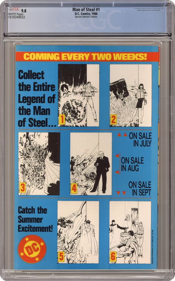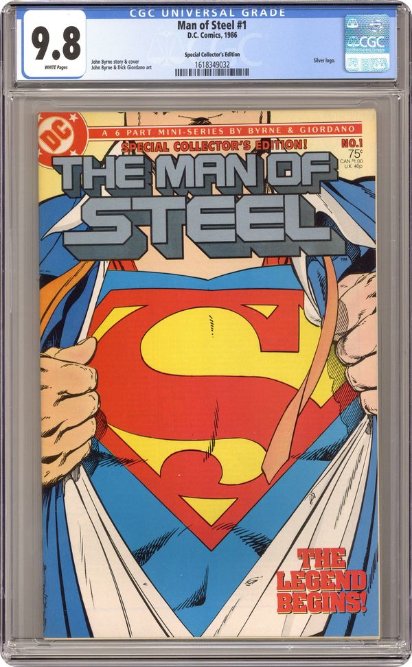 Special Collector's Edition. Published just a few months after Crisis on Infinite Earths, John Byrne's The Man of Steel updated the saga of Superman for modern audiences. His origin was altered, as were many other aspects of the character. This first issue reveals that Kal-El was conceived via the mingling of seeds in a matrix chamber, Clark's powers developed slowly over time (meaning Superboy was written out of continuity), and Superman's body projected an aura that protected his now vulnerable costume. Written and drawn by John Byrne, with inks by Dick Giordano. Cover price $0.75. Grade: CGC 9.8 explanation of grade Condition: Used (collectible)