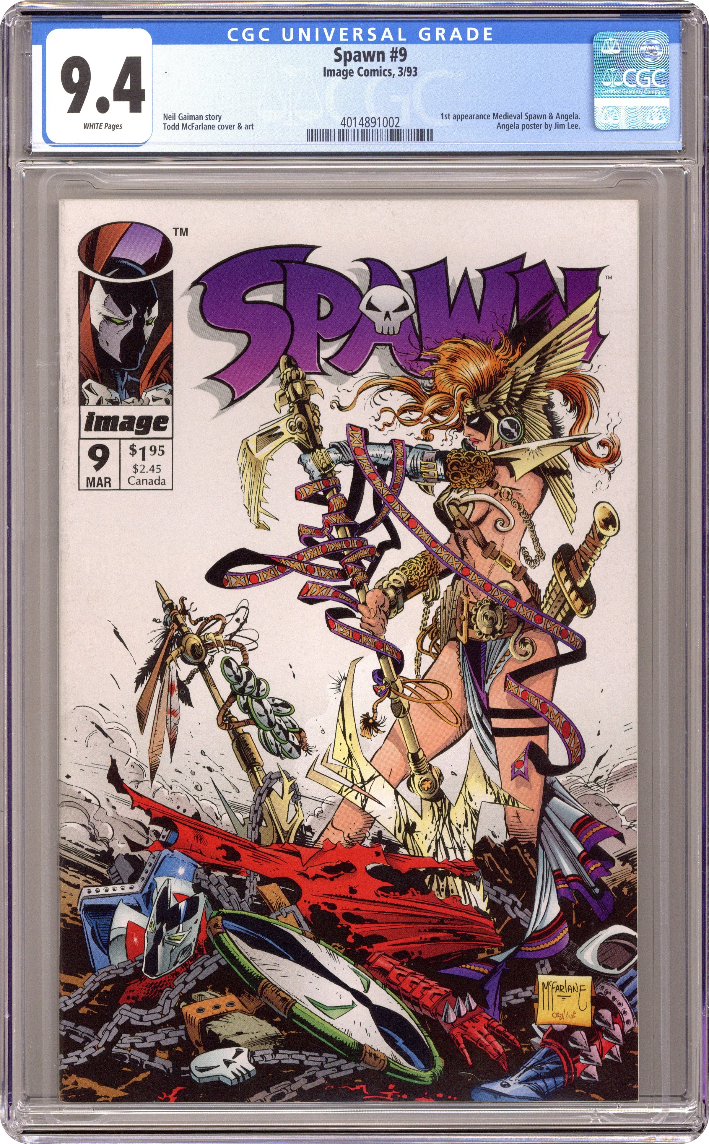 Ended Oct 3 2023 Winning Bid $27 Direct Edition. "Angela!" 1st appearance of Angela, Cagliostro, and Medieval Spawn. Story by Neil Gaiman. Art by Todd McFarlane. Spawn is attacked by Angela, a warrior of Heaven who has been hunting Hellspawns for centuries. Includes a B&W poster of Angela by Jim Lee and Todd McFarlane. Cover price $1.95. Grade: CGC 9.4 explanation of grade Condition: Used (collectible)