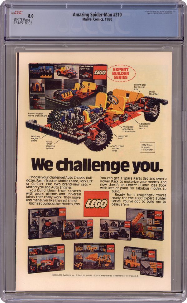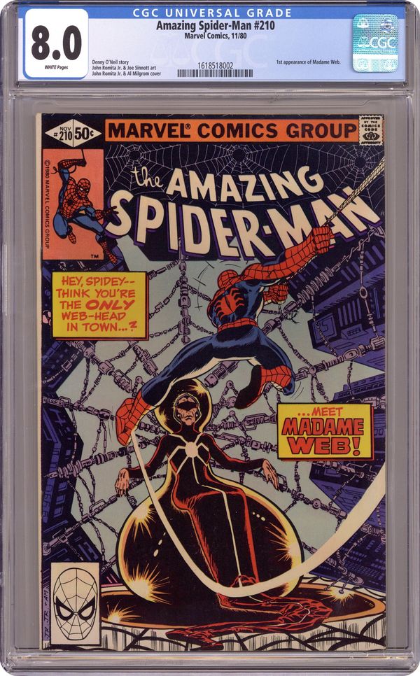 Direct Edition. "The Prophecy of Madame Web!" First appearance of Madame Web. Script by Denny O'Neil. Art by John Romita Jr. (breakdowns) and Joe Sinnott (finishes). Cover by John Romita Jr. and Al Milgrom. Masked gunmen barge into the board room of the Daily Globe and kidnap its publisher K.J. Clayton! Fortunately though, the web-slinger is nearby and gives chase! The wall-crawler doesn't catch the criminals, but he does catch a clue! A mysterious clairvoyant called Madame Web is somehow connected to the victim! After befriending the aging soothsayer and heeding her advice, Spider-Man rushes off to the rescue! Can the web-slinger find the missing publisher and get the Daily Globe back in circulation? Cameo appearance by J. Jonah Jameson. (Notes: Peter Parker ends his employment with the Daily Globe. Madame Web appears next in Amazing Spider-Man 216. John Romita Jr. begins his three-and-a-half year run as the penciler of the Amazing Spider-Man title.) 36 pages, full color. Cover price $0.50. Grade: CGC 8.0 explanation of grade Condition: Used (collectible)