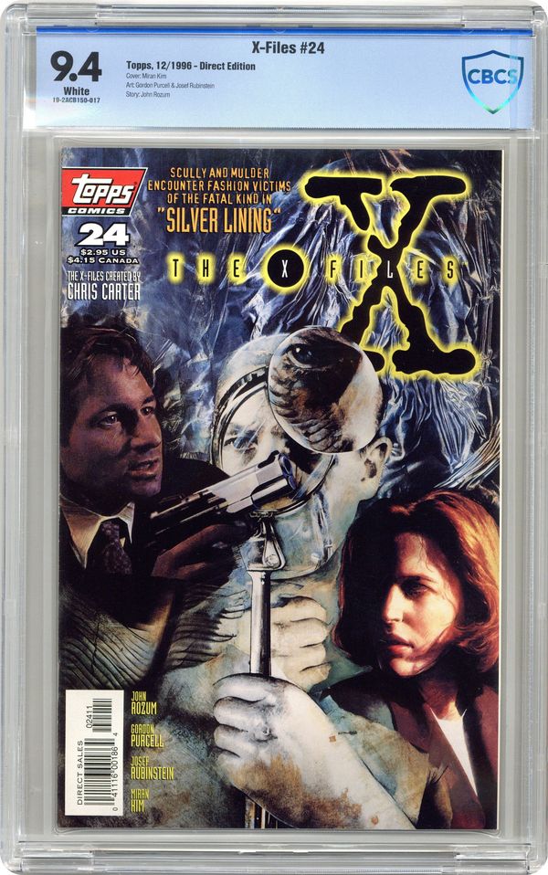 Ended Jun 24 2024 Winning Bid $12 Cover by Miran Kim. "Silver Lining." Story by John Rozum. Pencils by Gordon Purcell. Inks by Josef Rubenstein. A man disfigured in a car accident finds a coat with a special lining. It can drain the life from others and use it to repair his damaged face. Can Scully and Mulder find him and stop him before his transformation is complete and he disappears? 32 pages. Full color. Cover price $2.95. Grade: CBCS 9.4 explanation of grade Condition: Used (collectible)
