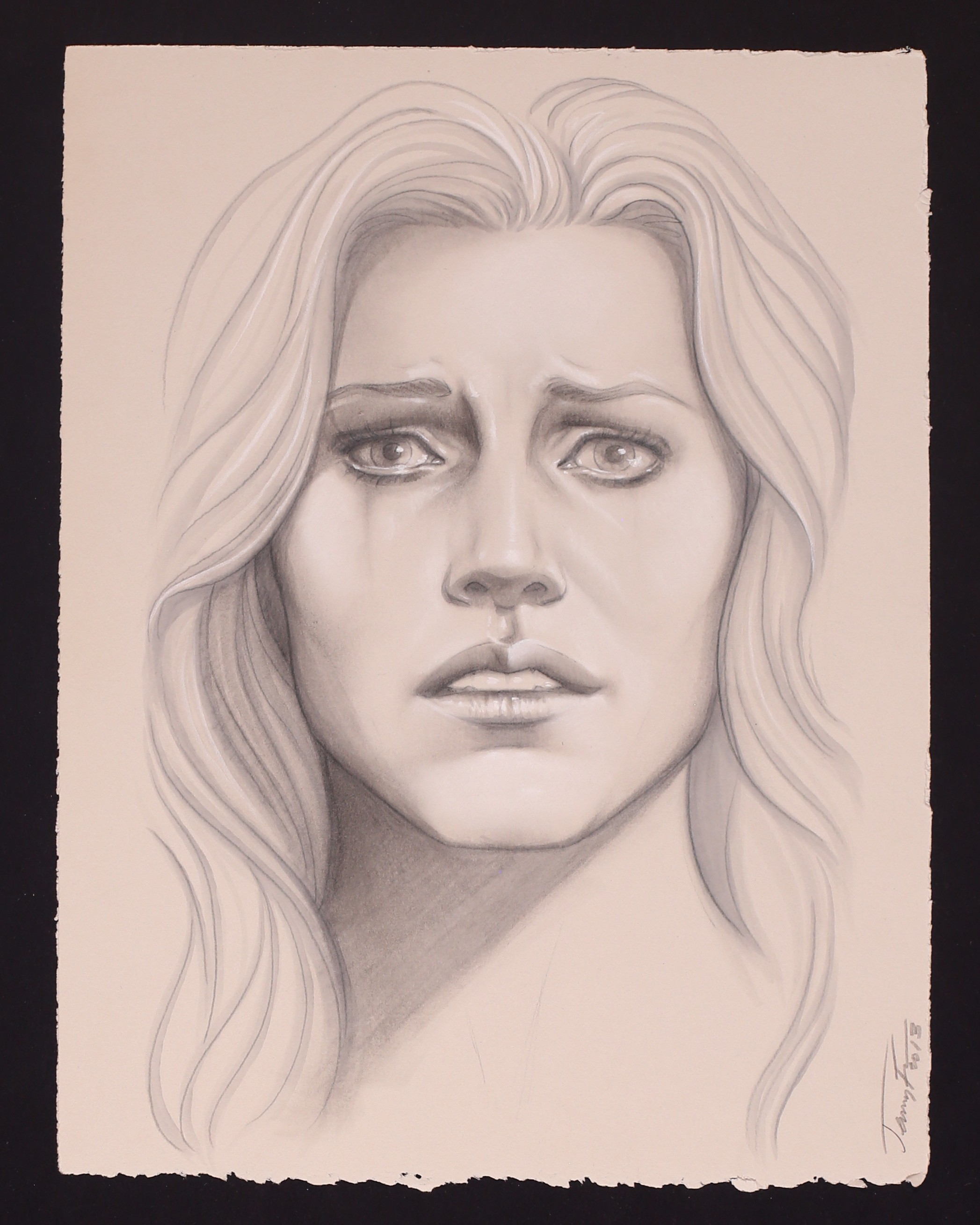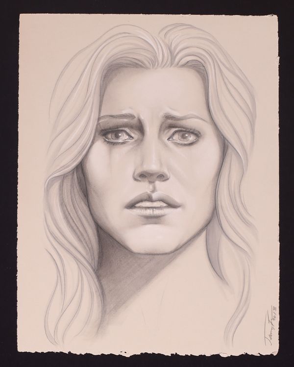 Original Cover Art from Battlestar Galactica: Six #1A (2014 Dynamite) by Jenny Frison. One of the premiere cover artists of the modern era, Jenny Frison's talent for capturing intense emotion in her realistic style is on full display in the original art for this stunning cover. Without the digitally added shattered glass effect present on the final cover, it's Frison's masterful shading and pitch-perfect depiction of Tricia Helfer that expresses the identity crisis that the newly created Cylon is experiencing. Signed by the artist. Pencil, colored pencil, and Copic markers on heavy paper stock. 8 1/2" x 11", B&W.