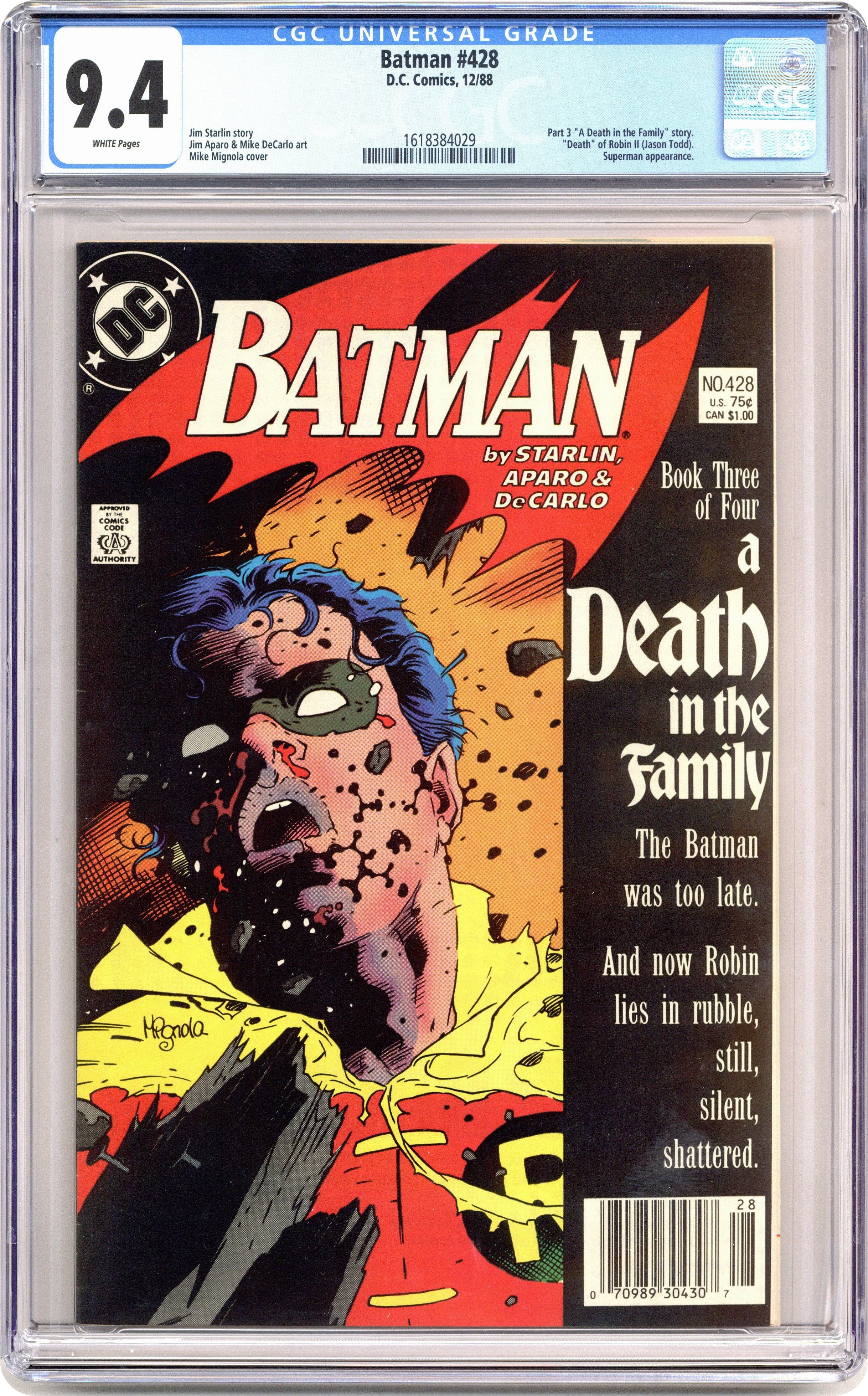 First printing. Direct Edition. Cover art by Mike Mignola. "A Death in the Family" part 3 of 4, script by Jim Starlin, pencils by Jim Aparo, inks by Mike DeCarlo; Death of Sheila Haywood; Burial of Sheila Haywood and Jason Todd; The Joker becomes the Iranian Ambassador to the U.N. Results of Phone Poll as to whether Robin dies this issue or not. NOTE: Most issues from 397-432 were reprinted in 1989 and sold in multipacks. These 2nd and 3rd prints have back cover ads dated 1989. 36 Pages, Full Color. Cover price $0.75. Grade: CGC 9.4 explanation of grade Condition: Used (collectible)