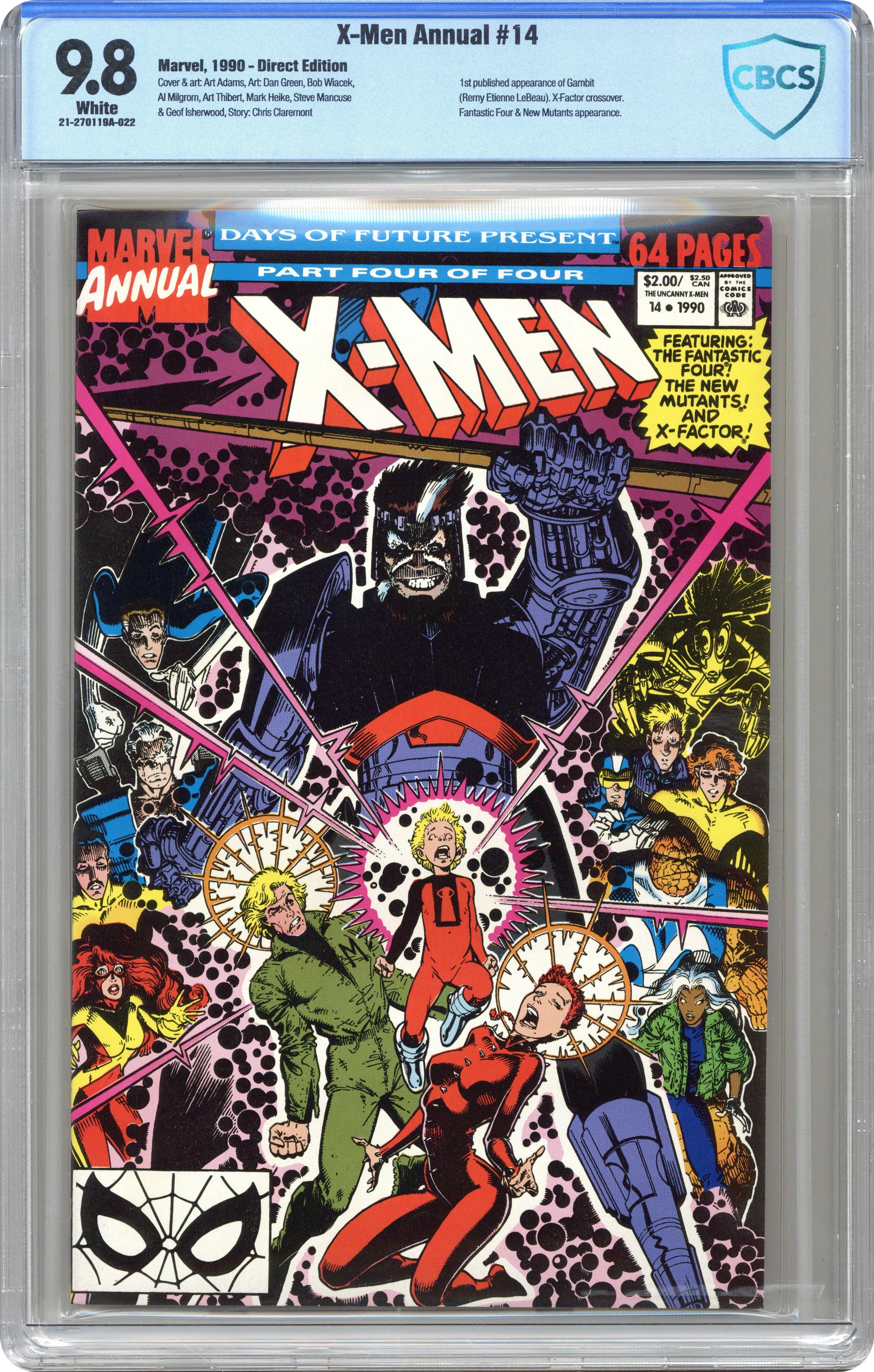Ended Jul 15 2023 Winning Bid $145 Direct Edition. Days of Future Present part four of four "You Must Remember This" Guest starring the Fantastic Four, the New Mutants, and X-Factor. Script by Chris Claremont, pencils by Art Adams, inks by Dan Green, Bob Wiacek, Al Milgrom, Art Thibert, and Steve Mancuse. First appearance of Gambit (brief cameo). Wolverine, Jubilee, and Psylocke star in "The Fundamental Things." Script by Claremont, pencils by Mark Heike, inks by Geof Isherwood. Pin-ups by Kevin Nowlan and Michael Golden. Adams cover. 68 pgs. Cover price $2.00. Grade: CBCS 9.8 explanation of grade Condition: Used (collectible)