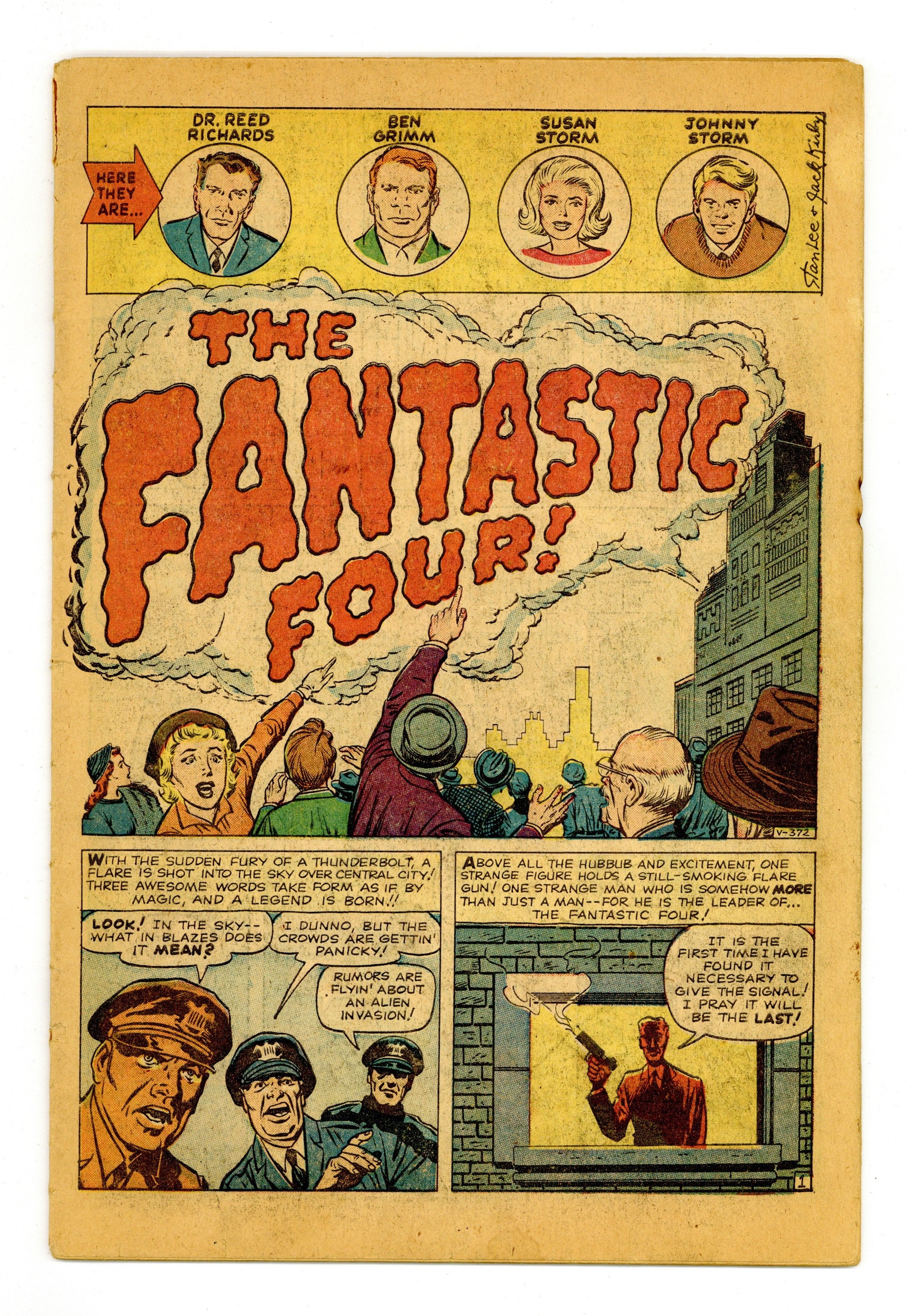 Cover pencils by Jack Kirby, inks by George Klein. The issue that started the Marvel Age of comics. First appearance of Mr. Fantastic, the Thing, the Human Torch (Johnny Storm), and the Invisible Girl as they battle the Mole Man in "The Fantastic Four!", script by Stan Lee, pencils by Jack Kirby, inks by George Klein; Dr. Reed Richards takes his friends on a rocket trip that changes their lives forever. The Fantastic Four Meet the Mole Man!, script by Stan Lee, pencils by Jack Kirby, inks by George Klein; Atomic plants disappear all around the world; Reed Richards pinpoints a place which is at the same distance from them all: Monster Isle. The Moleman's Secret!, script by Stan Lee, pencils by Jack Kirby, inks by George Klein; Having captured the Fantastic Four, Moleman recounts how he discovered his underground kingdom. 36 pgs. $0.10. Cover price $0.10. Grade: Coverless explanation of grade Condition: Used (collectible)
