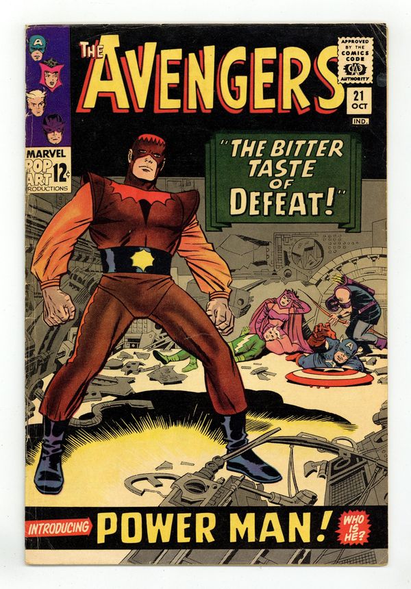 Cover pencils by Jack Kirby, inks by Wally Wood. "The Bitter Taste of Defeat!", script by Stan Lee, pencils by Don Heck, inks by Wally Wood; Enchantress uses the machine that Zemo used to create Wonder Man (see The Avengers #9) to turn one of Zemo's minions into Power Man; The two use tricks--and the Avengers' own internal discord--to make the Avengers appear dysfunctional; The City Council orders them to disband! Avengers Roll Call: Captain America, Hawkeye, Quicksilver, and the Scarlet Witch. Villains: the first Power Man (Erik Josten) and the Enchantress. Guest appearance by Tony Stark (Iron Man). Flashback cameos by the first Baron Zemo, the Executioner, and Wonder Man. Letter to the editor from comics writer Mike Friedrich. Reprinted in Marvel Triple Action #15. 36 pgs., full color. $0.12.