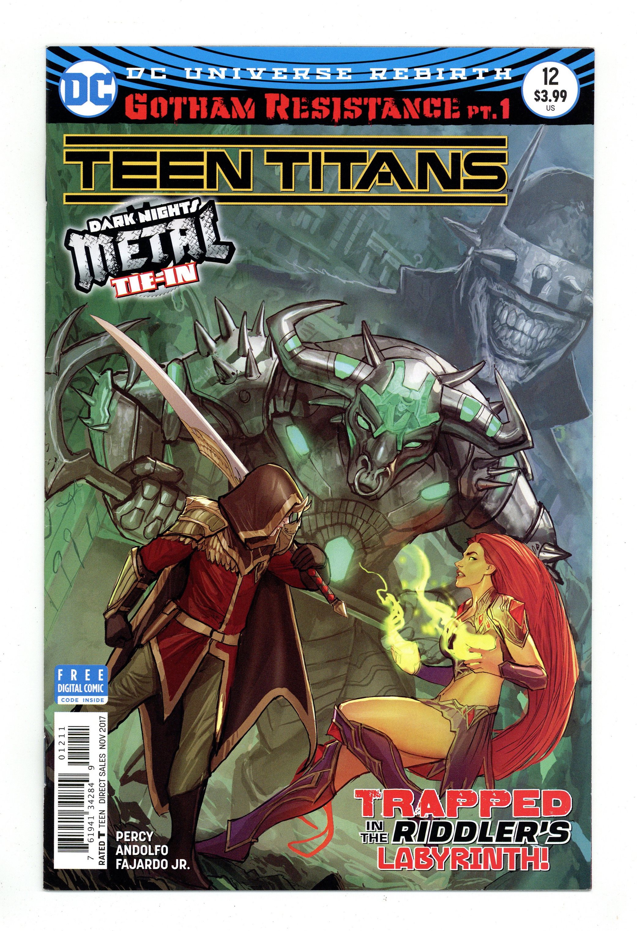 Written by Ben Percy. Art by Mirka Andolfo. Cover by Stjepan Sejic. A DARK NIGHTS: METAL tie-in! 'GOTHAM RESISTANCE' part one! The fight for Gotham City's soul starts here! When Robin receives a distress call from Nightwing urging him to return home, he discovers that Gotham City has been transformed into a mosaic of monsters, magic and doom! Trapped inside the Riddler's deadly maze with nowhere to turn, Robin soon assembles an unlikely team of hometown heroes including Batgirl, Harley Quinn, Killer Croc, Black Canary and Green Arrow to find the missing Nightwing and save their city! 32 pages, full color. Rated T Cover price $3.99. Grade: VF- 7.5 explanation of grade Condition: Used (collectible)