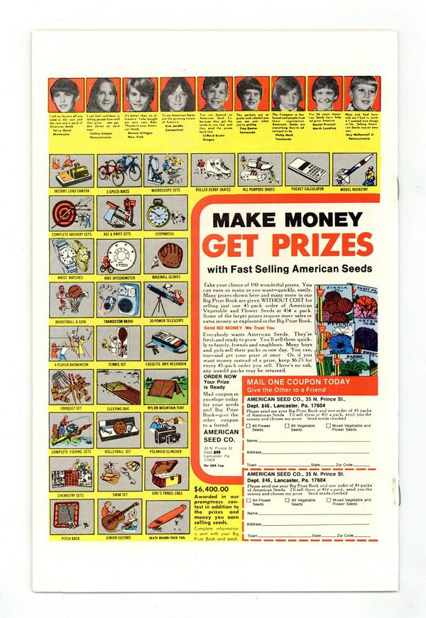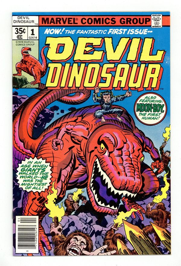 Cover pencils by Jack Kirby, inks by Frank Giacoia. Devil Dinosaur and Moon-Boy, script by Jack Kirby, pencils by Jack Kirby, inks by Mike Royer; Deep in the Valley of the Flame, Moon-Boy reveals the origins of Devil Dinosaur; Is the red-skinned and red-eyed Dino as menacing as the town-folk believe? 36 pgs., full color. $0.35. Cover price $0.35. Grade: VF+ 8.5 explanation of grade Condition: Used (collectible)
