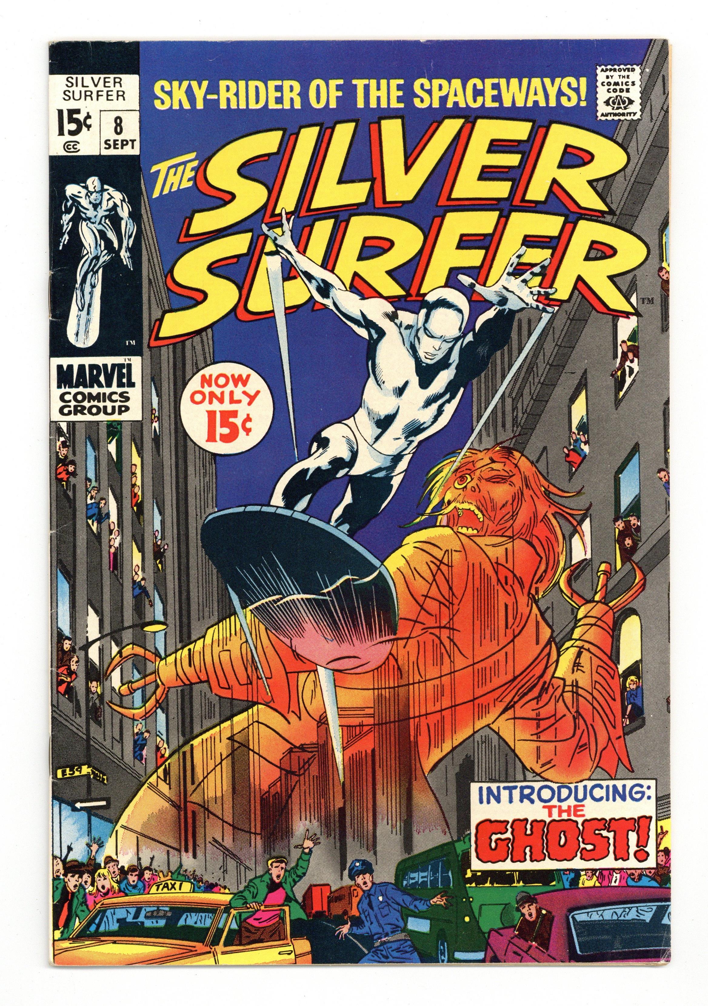 "Now Strikes the Ghost!" Part 1 of 2. Written by Stan Lee. Art by John Buscema and Dan Adkins. Mephisto, the very embodiment of evil, sends a powerful emissary, The Flying Dutchman, to destroy his hated enemy, the Silver Surfer. Cover price $0.15. Grade: FN- 5.5 explanation of grade Condition: Used (collectible)