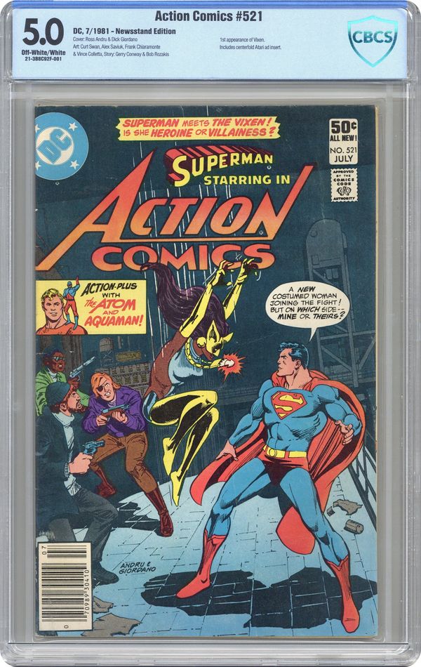 Direct Edition. Cover pencils by Ross Andru, inks by Dick Giordano. "The Deadly Rampage of the Lady Fox," script by Gerry Conway, pencils by Curt Swan, inks by Frank Chiaramonte; In New York City, the Vixen steals a van full of furs that belong to entrepreneur Mordecai Mule; Superman, attending a function at Madison Square Garden, learns of the robbery and gives chase; Superman and Vixen team up to stop a horde of elephants. "Grow, Little Growfish!", script by Bob Rozakis, pencils by Alex Saviuk, inks by Vince Colletta; Off the coast of Virginia, Aquaman experiments with his telepathic powers by sending out a routine mental scanning wave; He discovers a large, gelatinous organism that shrinks in size; Aquaman contacts the Atom, who teleports over to investigate. 36 Pages, Full Color, $0.50. Cover price $0.50. Grade: CBCS 5.0 explanation of grade Condition: Used (collectible)