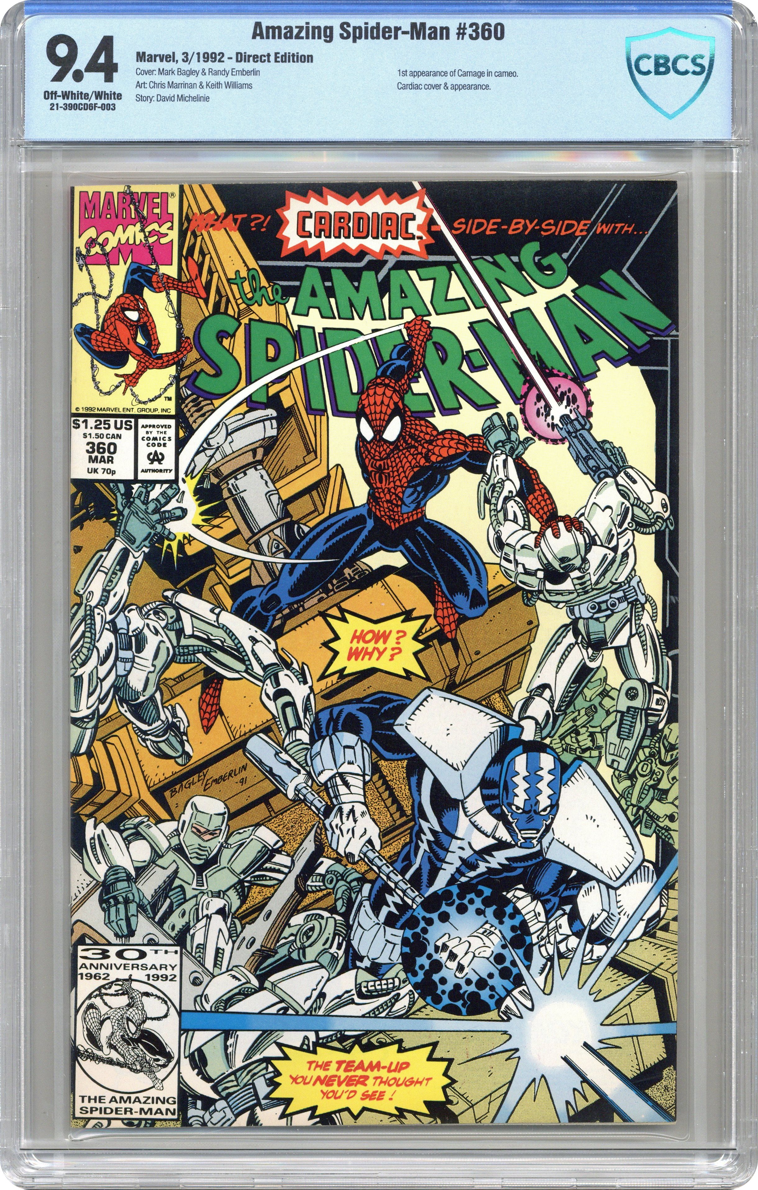 Ended Jan 5 2023 Winning Bid $29 Direct Edition. "Death Toy!" Part 2 of 2. Script by David Michelinie. Pencils by Chris Marrinan. Mark Bagley. Inks by Keith Williams. Cover by Mark Bagley and Randy Emberlin. At the Tech-Toy warehouse, Cardiac and the wall-crawler come to a meeting of the minds about their pursuits of justice! Perhaps it's possible for them to work together after all! The next evening at Stane International, Spider-Man and Cardiac team up to stop the illegal manufacturing of military weapons! Could this be the beginning of a beautiful friendship? Not quite! Meanwhile, a new blood-hued super-villain makes his first savage kill...the first of many! Cameo appearances by Carnage, Mary Jane Watson, Ben Urich, Joy Mercado, and J. Jonah Jameson. Origin of Cardiac. (Notes: Cardiac returns in Amazing Spider-Man 376. The letters page contains a statement of ownership: average print run 470,075; average paid circulation 340,977.) 36 pages. $1.25 cover price. Cover price $1.25. Grade: CBCS 9.4 explanation of grade Condition: Used (collectible)