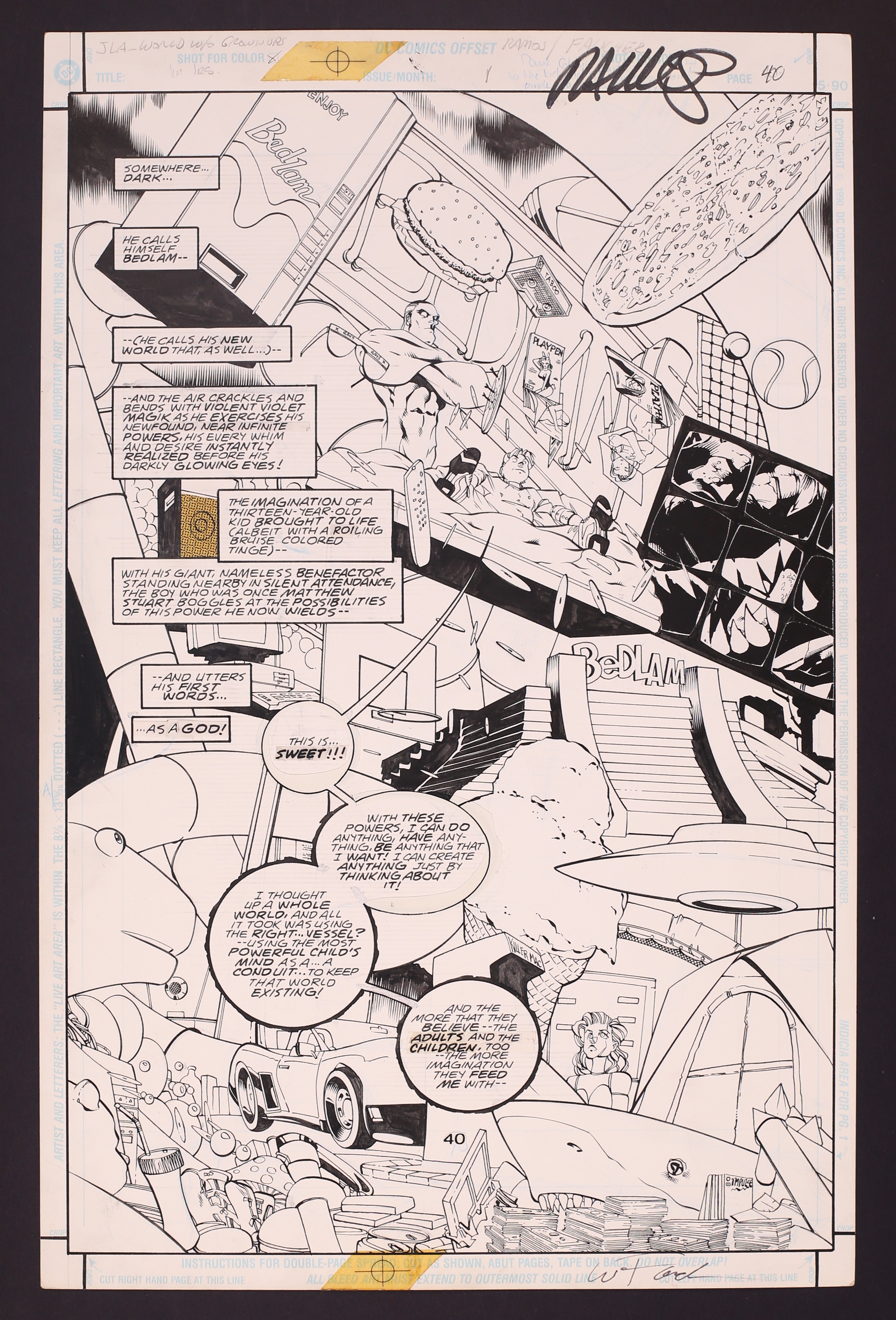 Original Art from JLA World Without Grown-Ups #1 (1998 DC) Splash Page 40 Pencils by Humberto Ramos, Inks by Wayne Faucher. A massive, jam-packed splash that functions as the big villain reveal for this story and what a reveal it is! Matthew Stuart, the son of an always-travelling archaeologist was gifted an Atlantean artifact for his birthday but little did he know it would turn out to the vessel for the dark energies of a powerful sorcerer that gave him the power of a god- and what's the first thing any bratty pre-teen would do with that power? Get rid of all the adults, of course! Next up his building himself a stronghold full of pizza, sodas, TVs, sports cars, and nudie mags! Signed in top margin by Ramos and in bottom margin by Faucher. Pencil, ink, and screentone on DC Comics art board. 11" x 17", B&W.