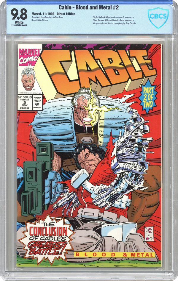 Ended Jan 2 2023 Winning Bid $26 Cover pencils by John Romita Jr., inks by Dan Green. Cable - Blood and Metal, script by Fabian Nicieza, pencils by John Romita Jr., inks by Dan Green; In the past, Cable betrays the Six Pack to try and take down Stryfe; In the present, Cable gives up defeating Stryfe to save Kane's life; In the future, Kane wakes up in Cable's world. Cable pinup, pencils by Greg Capullo, inks by Brad Vancata. 52 pgs. 2 issue mini-series. $2.50. Cover price $2.50. Grade: CBCS 9.8 explanation of grade Condition: Used (collectible)