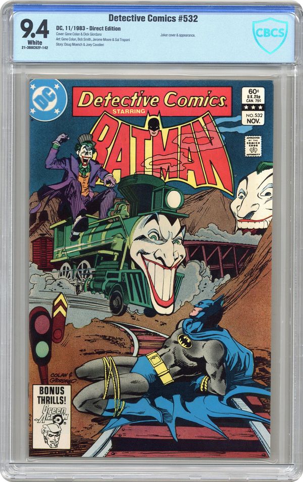 Last 60c cover-priced issue. "Laugh, Killer, Laugh!" Story by Doug Moench. Art by Gene Colan and Bob Smith. Vicki Vale is tied to the train tracks of Joker's amusement park from hell. Can the Caped Crusader free himself in time to save the woman he loves from a horrible fate? Plus, Green Arrow's arms caper concludes in "Soft Target!" Story by Joey Cavalieri. Art by Jerome Moore, Adrian Gonzales, and Sal Trapani. 36 pgs. Cover price $0.60. Grade: CBCS 9.4 explanation of grade Condition: Used (collectible)