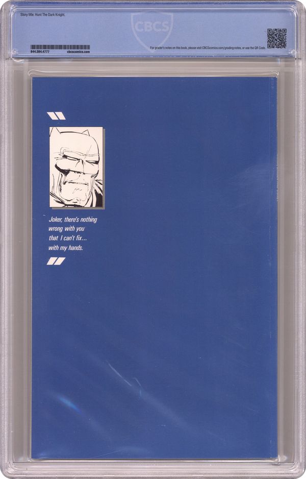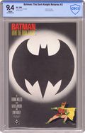 1st printing. NOTE: 2nd printing of #3 is clearly labeled as such on the inside cover. "Hunt The Dark Knight," script and pencils by Frank Miller, inks by Klaus Janson and Frank Miller; Batman battles the Joker, who has convinced his psychiatrist, Dr. Bartholomew Wolper, that he is sane and regretful; Seeking to discredit Batman, Wolper exhibits the Joker on a late-night show ("David Endochrine", parodying Late Night with David Letterman) to try and show that the Joker is actually a victim of Batman's own psychosis; As the police attack Batman, the Joker murders everyone in the studio; Batman follows him to Selina Kyle's place, where the former Catwoman has become a depressed alcoholic; Superman is introduced as an undercover agent for the American government. 52 pgs., full color. Cover price $2.95. Grade: CBCS 9.4 explanation of grade Condition: Used (collectible)