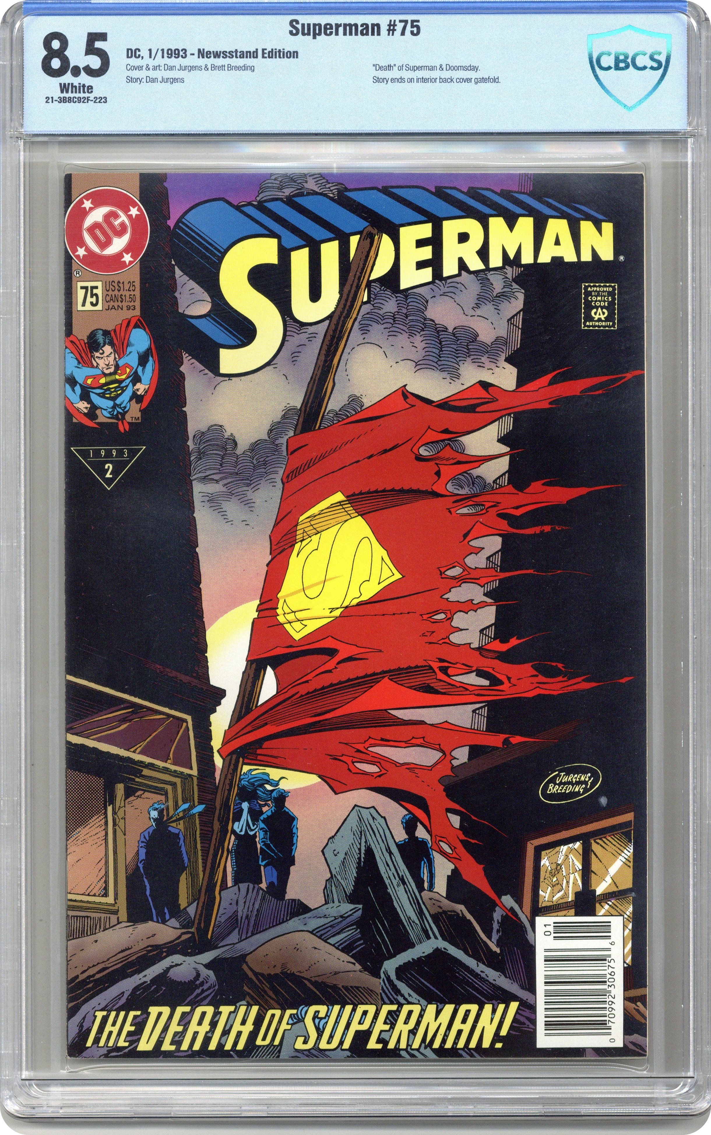 1st printing. Doomsday! Part 7 of 7. "Doomsday!" Story by Dan Jurgens. Art by Dan Jurgens and Brett Breeding. Here it is, the issue that rocked the DC Universe. An unstoppable force named Doomsday crash landed on Earth and has cut a swath of death and destruction across the country, all the way to Metropolis. Even the Justice League, the world's premiere super-team, was powerless before this creature's might. Now one man stands defiantly in Doomsday's way and vows that the creature's insanity stops here. Superman fights his strongest opponent to the death in the streets of Metropolis. NOTE: The event of "The Death of Superman" was so huge that it was reported on by the national media. - Odinson, Lonestar Comics Archivist Cover price $1.25. Grade: CBCS 8.5 explanation of grade Condition: Used (collectible)