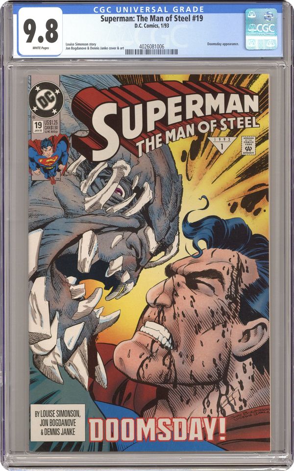 First Printing. Direct Edition. Written by Louise Simonson, with art and cover by Jon Bogdanove and Dennis Janke. Part 6 of the critical 7-part series 'Doomsday' that leads to a pivotal event in the life of the Man of Steel, continued from Action Comics (1938 DC) #684. The fight to the death intensifies as Doomsday and Superman hit Metropolis - hard! Concludes in Superman (1987) #75. Cover price $1.25. Grade: CGC 9.8 explanation of grade Condition: Used (collectible)