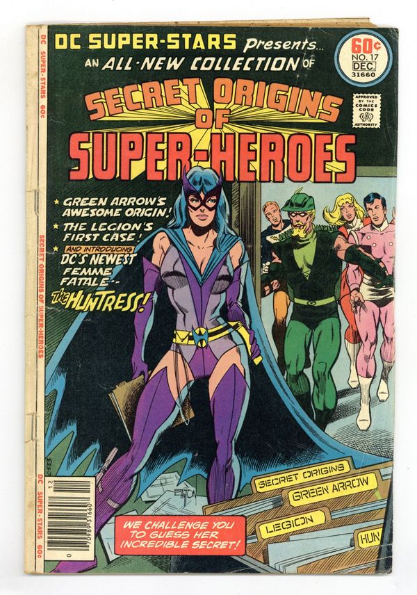 Secret Origins of Super-Heroes -- an all-new collection! Green Arrow's awesome origin! The Legion's first case! And introducing DC's newest femme fatale -- the Huntress! Featuring: 1 page Legion of Super-Heroes; Huntress; Green Arrow story "Secret Origins of Super-Heroes" written by Paul Levitz and drawn by Jim Aparo; 10 page Green Arrow story "Origin of Green Arrow" written by Denny O'Neil and drawn by Mike Grell & Bruce Patterson; 10 page Legion of Super-Heroes story "The Secret of the Quintile Crystal!" starring the Legion of Super-Heroes [Cosmic Boy; Saturn Girl; Lightning Lad] (origin retold), Superman (cameo), R.J. Brande and Lord Lorval (villain), written by Jack C. Harris and drawn by Juan Ortiz & Bob Smith; 1 page text article "Secret Origins of Secret Origins" by Paul Levitz; 1 page Huntress illustration "Huntress Concept Art" drawn by Joe Staton (concept sketch) and Joe Orlando (cover design); 13 page Huntress story "From Each Ending...A Beginning!" starring Huntress [Helena Wayne] (origin), Batman (Earth-2), Catwoman (Earth-2), Flash [Barry Allen] (flashback), Flash [Jay Garrick] (flashback), Robin (Earth-2, flashback), Silky Cernak (villain) and Commissioner Gordon (Earth-2, cameo), written by Paul Levitz and drawn by Joe Staton & Bob Layton. Cover by Joe Staton & Bob Layton. Note : First appearance of second Huntress (Helena Wayne). This is shared by All Star Comics (1940-1978) #69 as they came out on the same day. Cover price $0.60. Grade: GD 2.0 explanation of grade Condition: Used (collectible)