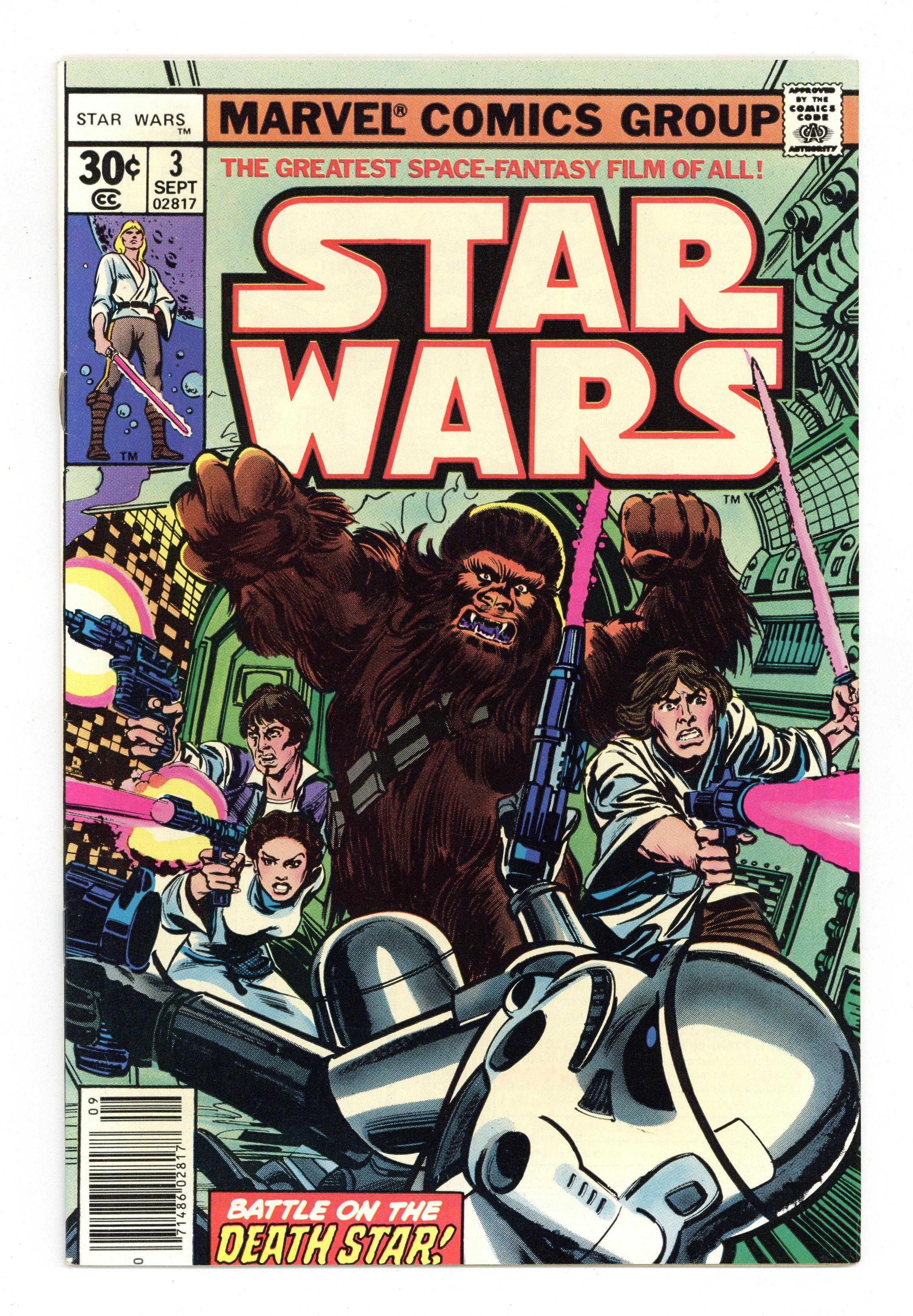 1st printing, standard 30 Cent Newsstand Edition with UPC. A New Hope: Part 3 of 6. "Death Star!" Based on the screenplay by George Lucas. Adapted by Roy Thomas. Art by Howard Chaykin and Steve Leialoha. The evil Galactic Empire tests its ultimate weapon on Princess Leia's homeworld with devastating results. Meanwhile, Ben Kenobi begins Luke Skywalker's training in the ways of the force. However things take a turn for the worse when the Millennium Falcon is captured within the unrelenting grasp of the Death Star's tractor-beam. Now, it's up to this small motley band of heroes to mount a daring rescue attempt of the Princess from within the very bowels of the Empire's most powerful weapon. Cover price $0.30. Grade: VF 8.0 explanation of grade Condition: Used (collectible)