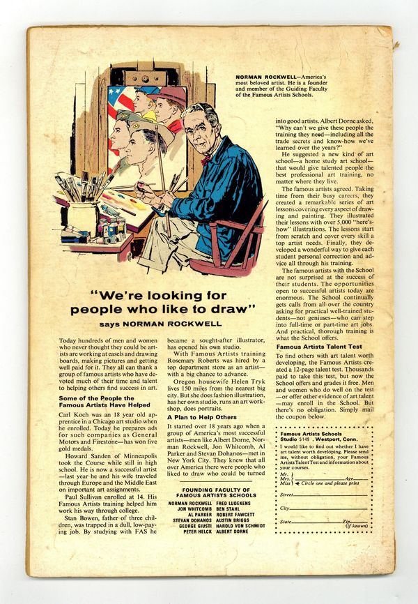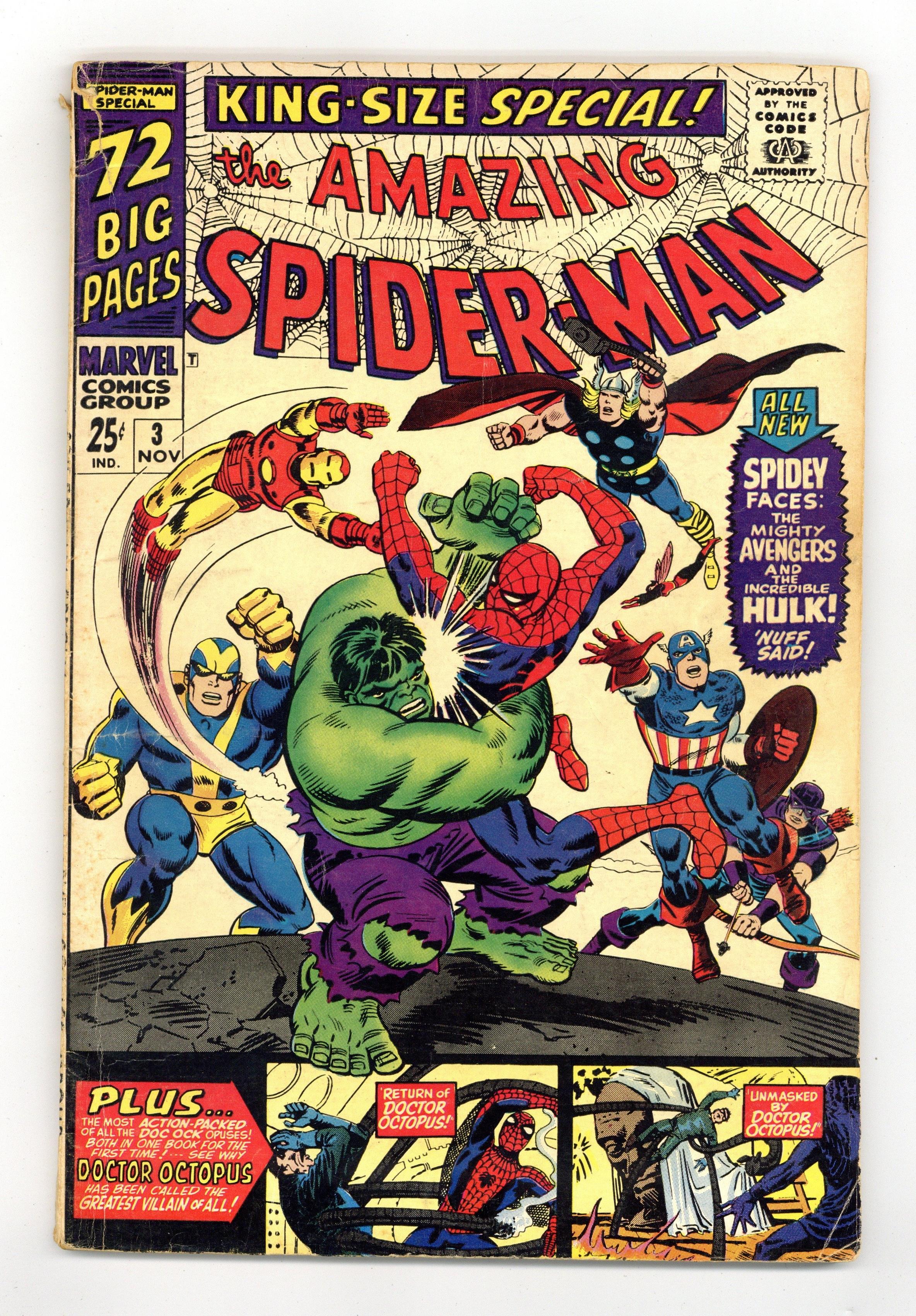 Cover pencils by John Romita and Steve Ditko, inks by Mike Esposito and Steve Ditko. Spidey faces the Avengers and the Hulk in a new 21-page story, "To Become an Avenger!", script by Stan Lee, layouts by John Romita Sr., pencils by Don Heck, inks by Mickey Demeo; The Avengers decide to ask Spider-Man to join the team but first he has to complete a test to prove himself; Reprinted in Marvel Tales # 181. The test is to capture the Hulk. Turning Point, script by Stan Lee, art by Steve Ditko; Betty's brother has gotten himself into trouble with gambling debts and Betty is forced to help in Doc Ock's plot to break Blackie Gaxton out of prison to keep her sibling alive; Spider-Man interrupts the escape and Blackie shoots Bennett during the conflict; reprinted from Amazing Spider-Man 11. Unmasked by Dr. Octopus, script by Stan Lee, art by Steve Ditko; Peter has the 24 hour flu when Doc Ock captures Betty Brant in hopes of luring Spider-Man into battle; Ock beats the sick web-head and unmasks him, but everyone thinks it is just Peter trying to be brave by impersonating Spidey; reprinted from Amazing Spider-Man 12. 76 pgs., full color. Cover price $0.25. Grade: GD+ 2.5 explanation of grade Condition: Used (collectible)