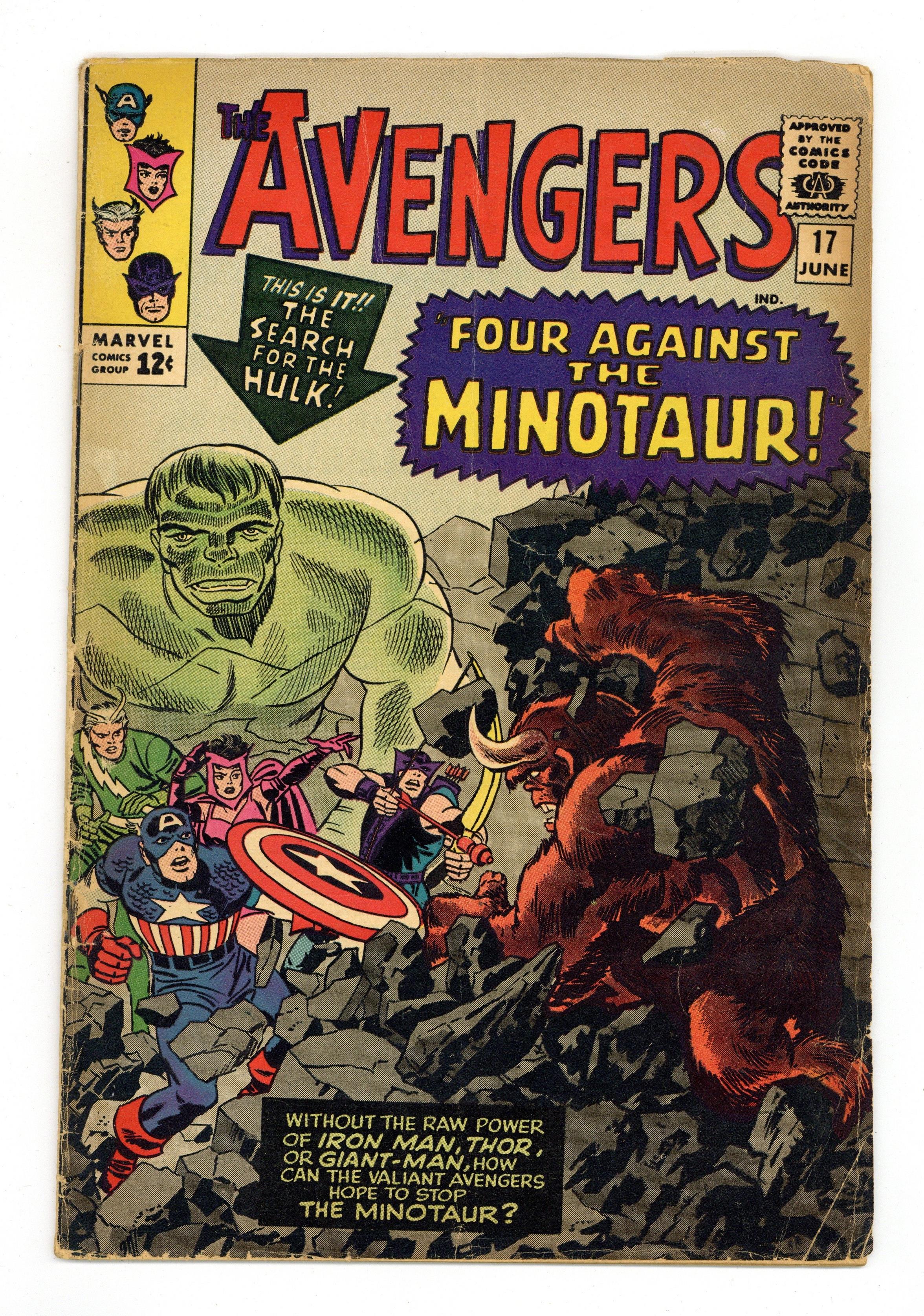 "Four Against the Minotaur!" Script by Stan Lee, pencils by Don Heck (some faces retouched by Jack Kirby), inks by Dick Ayers. Avengers Roll Call: Captain America, Hawkeye, Quicksilver, Scarlet Witch, and Rick Jones. Villains: the Mole Man, the Leader, and the first and only appearance of a minotaur. Guest appearance by the Hulk. As this and the story from Tales to Astonish 69 take place at the same time, some panels are reproductions of the Astonish panels. Reprinted in Marvel Triple Action # 11. Kirby/Frank Giacoia cover. 36 pgs. Cover price $0.12. Grade: GD 2.0 explanation of grade Condition: Used (collectible)