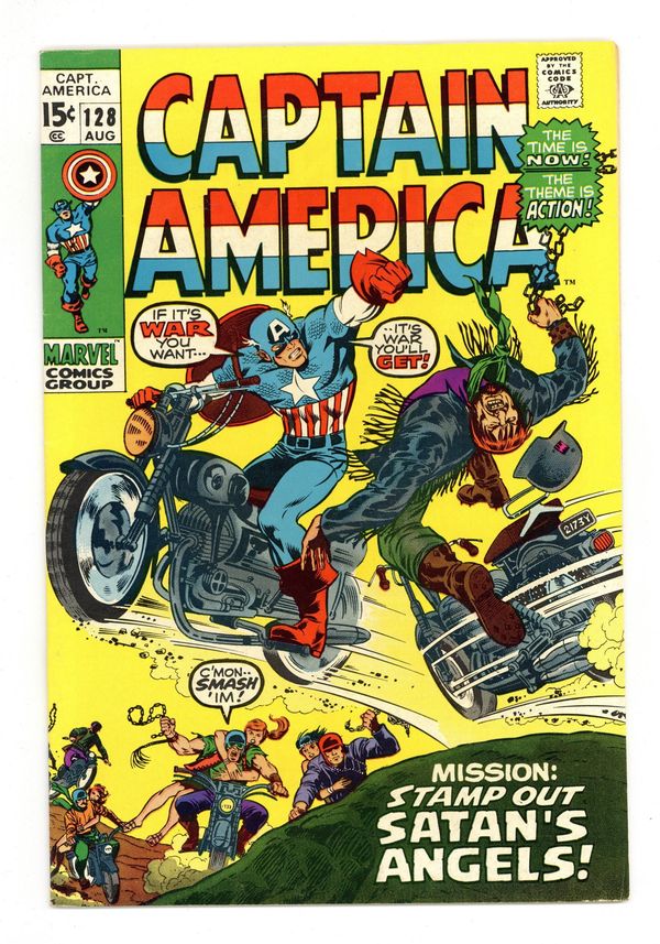 Ended Jan 3 2024 Winning Bid $20 Cover pencils by Marie Severin, inks by Joe Sinnott. "Mission: Stamp Out Satan's Angels," script by Stan Lee, pencils by Gene Colan, inks by Dick Ayers; Dismayed by hearing comments from the people that Captain America is washed up, Steve Rogers buys a motorcycle for driving across the country; Entering Coits Neck, he gets arrested by a policeman who thinks hes a member of Satans Angels; The Angels break Steve out of jail; Steve refuses to go with them and then rents a room in town; Later, the Angels terrorize an outdoor music festival by racing their motorcycles through the audience; Cap arrives on his bike to stop the destruction; Gang member Whitey tries to run down Cap with his bike; Cap fends him off with his shield; Red Skull watches this conflict on a view screen. Cameos by the Red Skull, Bucky Barnes, Baron Zemo, Clark Gable, and W.C. Fields. 36 pgs., full color. $0.15. Cover price $0.15. Grade: FN/VF 7.0 explanation of grade Condition: Used (collectible)